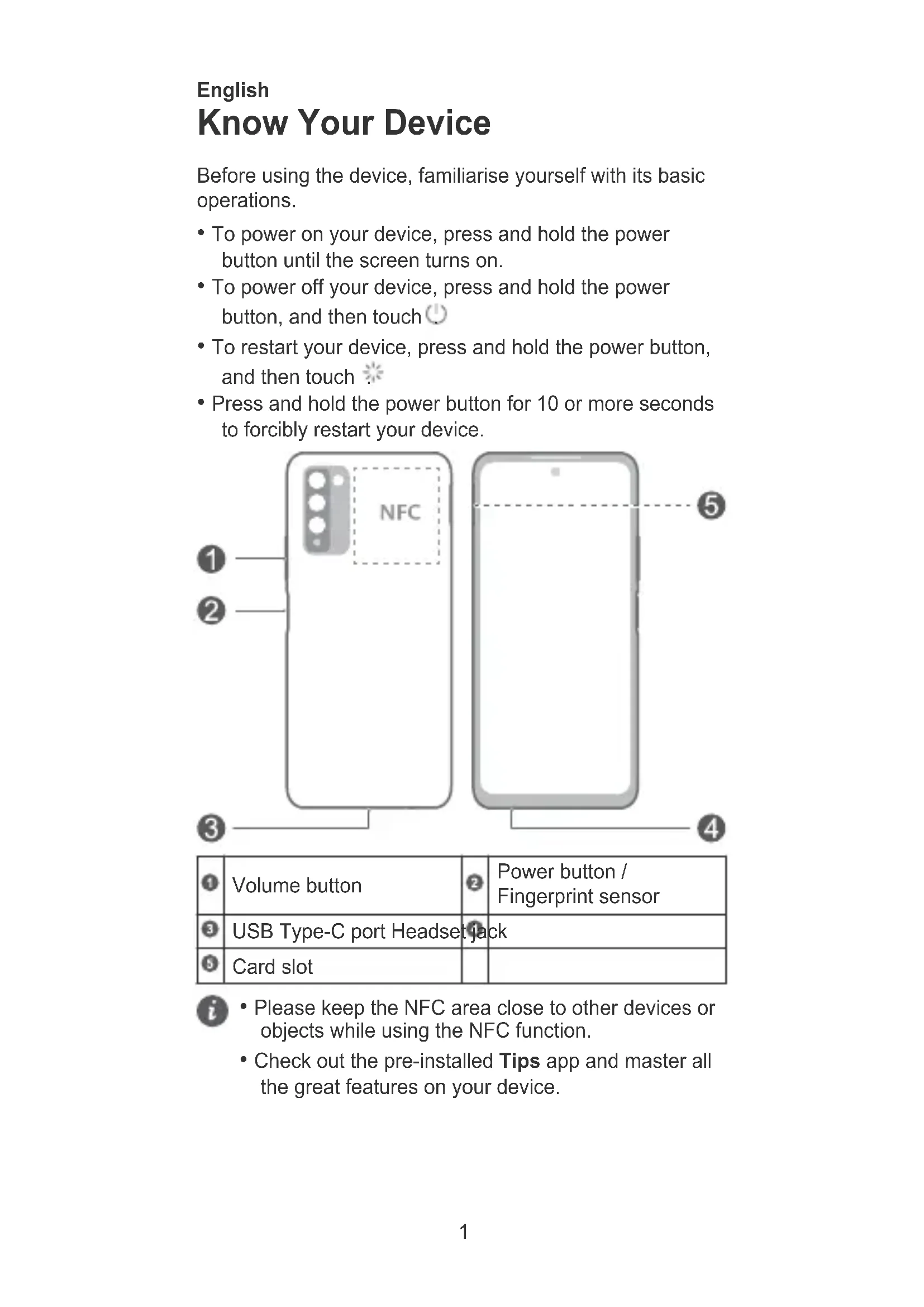 - Press and hold the power button for 10 or more seconds to forcibly restart your device. Volume button Power button / Fingerprint sensor USB Type-C port Headset jack Card slot