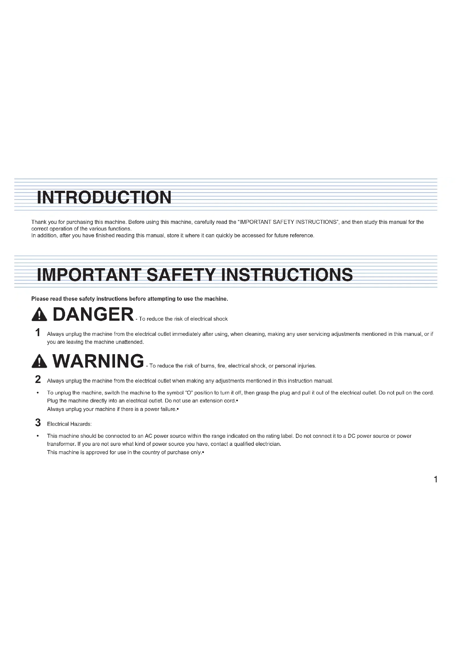 Please read these safety instructions before attempting to use the machine. DANGER - To reduce the risk of electrical shock Always unplug the machine from the electrical outlet immediately after using, when cleaning, making any user servicing adjustments mentioned in this manual, or if