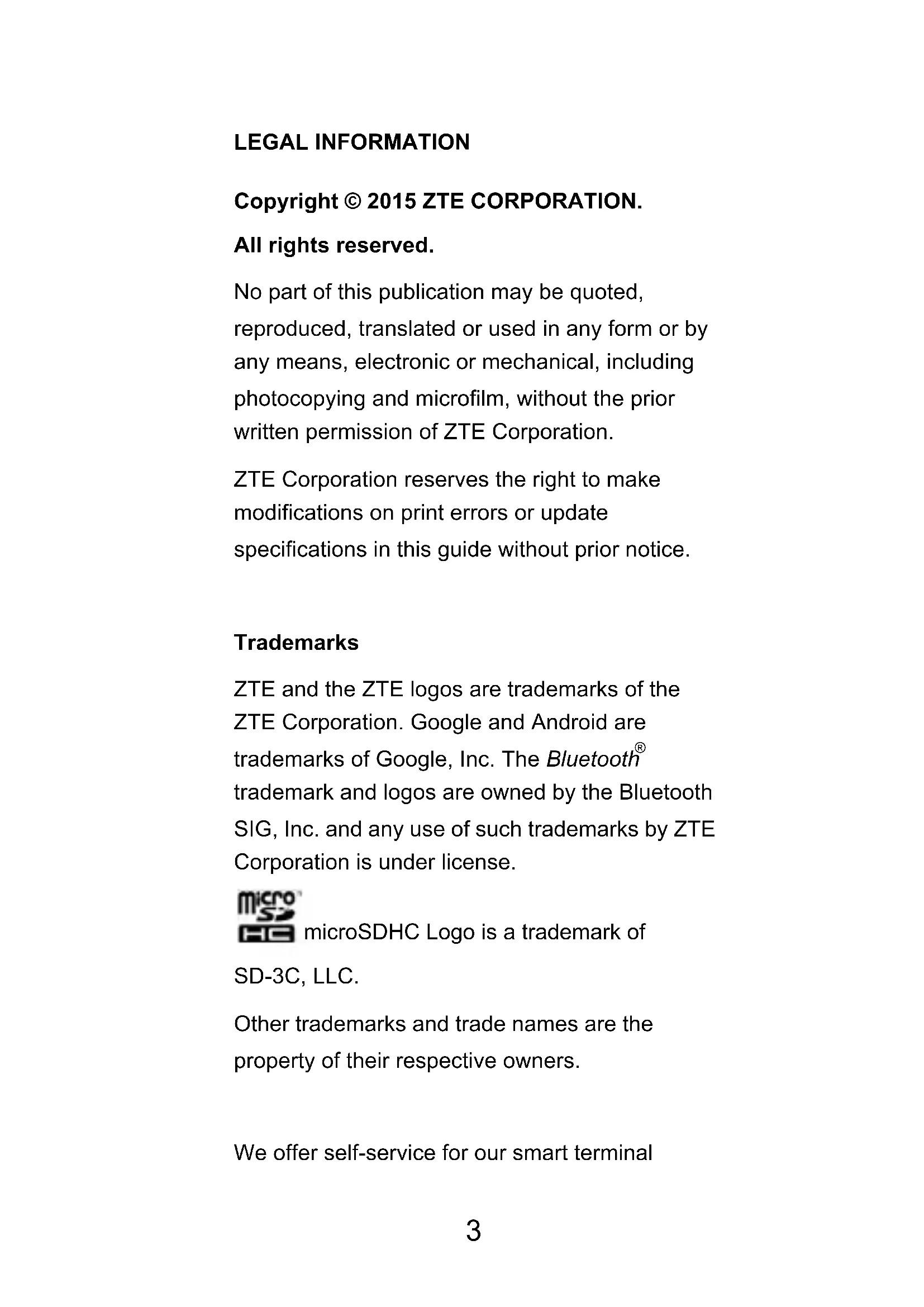 trademark and logos are owned by the Bluetooth SIG, Inc. and any use of such trademarks by ZTE Corporation is under license. microSDHC Logo is a trademark of SD-3C, LLC. Other trademarks and trade names are the property of their respective owners. We offer self-service for our smart terminal 3device users. Please visit the ZTE official website (at www.ztedevice.com) for more information on self-service and supported product models. Information on the website takes precedence. Visit http://www.ztedevice.com to download the user manual. Just click Service Support>User's manual from the home page and then select your location, product type, and name to search for related support information. Disclaimer ZTE Corporation expressly disclaims any liability for faults and damages caused by unauthorized modifications of the software.