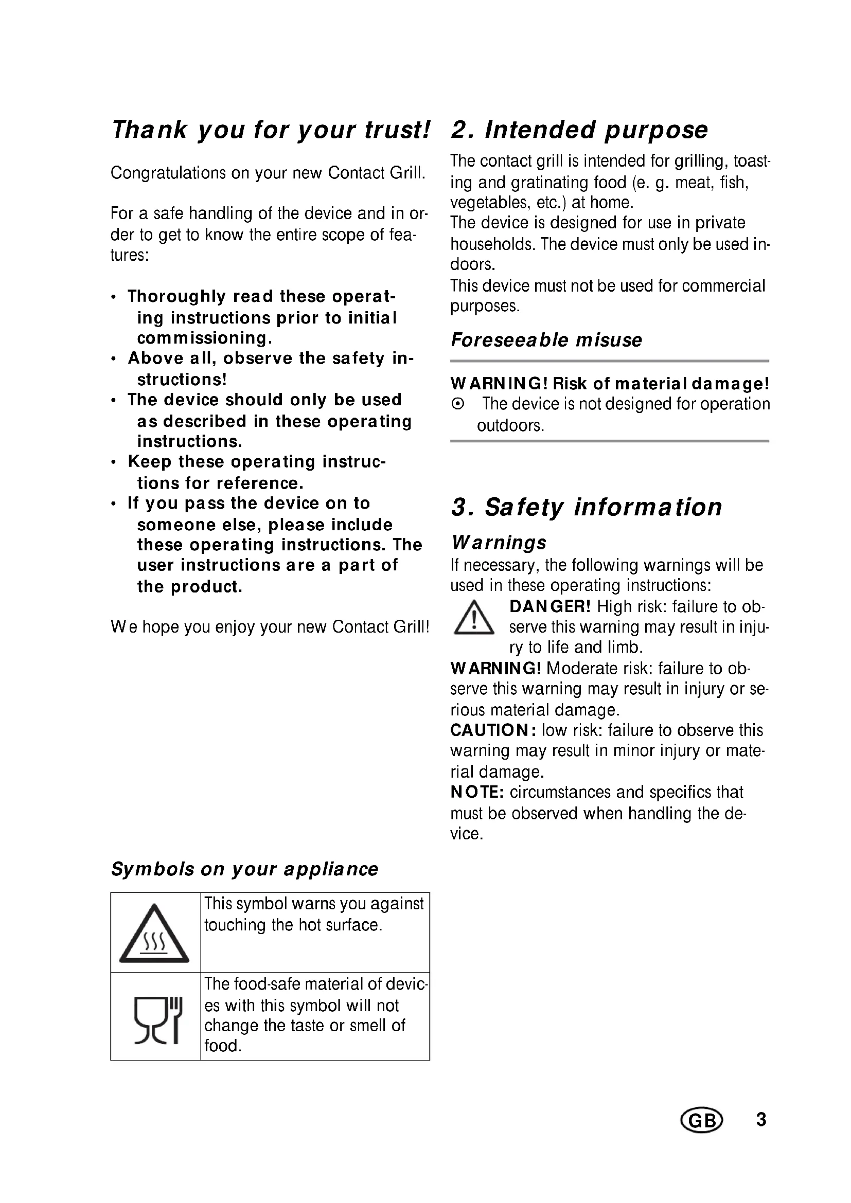 The contact grill is intended for grilling, toast- ing and gratinating food (e. g. meat, fish, vegetables, etc.) at home. The device is designed for use in private households. The device must only be used in- doors. This device must not be used for commercial purposes. Foreseeable misuse WARNING! Risk of material damage! ~ The device is not designed for operation outdoors.