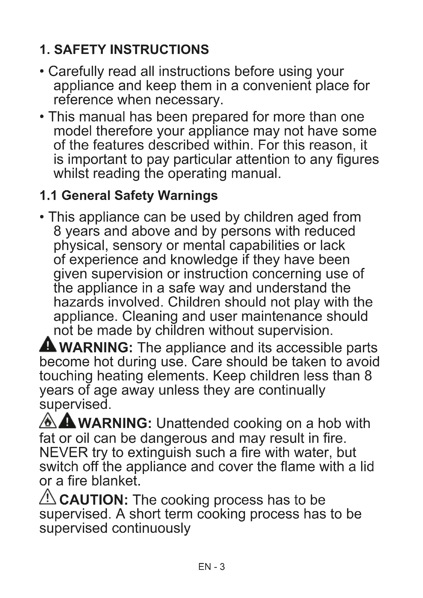 fat or oil can be dangerous and may result in fire. NEVER try to extinguish such a fire with water, but switch off the appliance and cover the flame with a lid or a fire blanket. CAUTION: The cooking process has to be supervised. A short term cooking process has to be supervised continuously