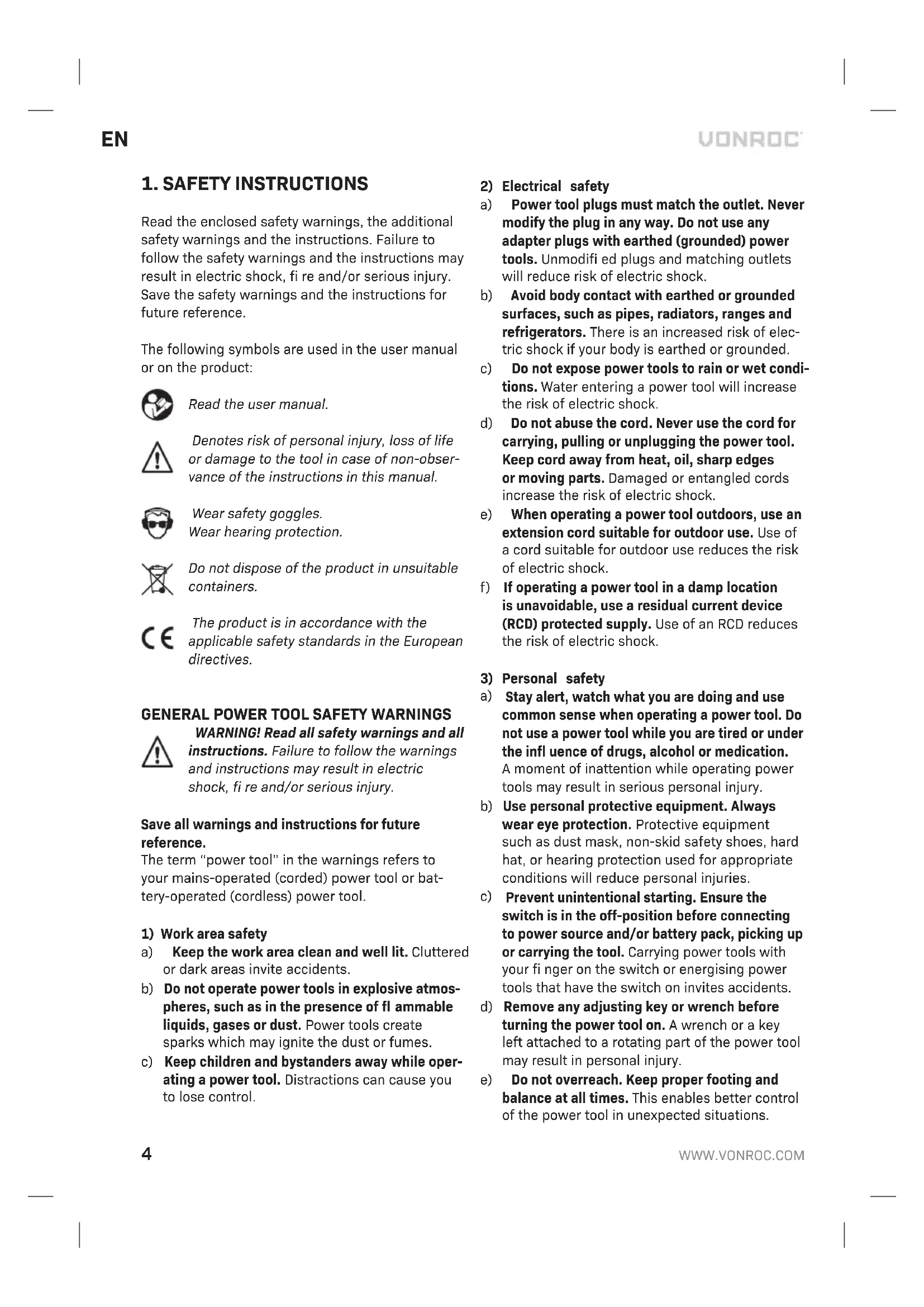 Before cleaning and maintenance, always switch off the machine and remove the mains plug from the mains. Clean the machine casings regularly with a soft cloth, preferably after each use. Make sure that the ventilation openings are free of dust and dirt. Remove very persistent dirt using a soft cloth moistened with soapsuds. Do not use any solvents such as gasoline, alcohol, ammonia, etc. Chemicals such as these will damage the synthetic components. ENVIRONMENT Faulty and/or discarded electrical or electronic apparatus have to be collected at the appropriate recycling locations. Only for EC countries Do not dispose of power tools into domestic waste. According to the European Guideline 2012/19/EC for Waste Electrical and Electronic Equipment and its implementation into national right, power tools that are no longer usable must be collected separately and disposed of in an environmentally friendly way. WARRANTY VONROC products are developed to the highest quality standards and are guaranteed free of defects in both materials and workmanship for the period lawfully stipulated starting from the date of original purchase. Should the product develop any failure during this period due to defective material and/or workmanship then contact VONROC directly. The following circumstances are excluded from this guarantee:
