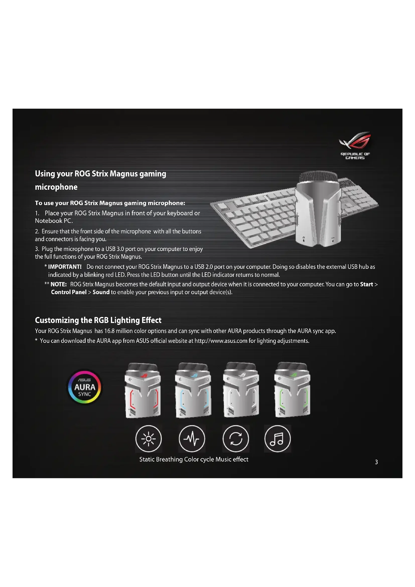 - IMPORTANT! Do not connect your ROG Strix Magnus to a USB 2.0 port on your computer. Doing so disables the external USB hub as indicated by a blinking red LED. Press the LED button until the LED indicator returns to normal. ** NOTE: ROG Strix Magnus becomes the default input and output device when it is connected to your computer. You can go to Start > Control Panel > Sound to enable your previous input or output device(s). Customizing the RGB Lighting Effect Your ROG Strix Magnus has 16.8 million color options and can sync with other AURA products through the AURA sync app.