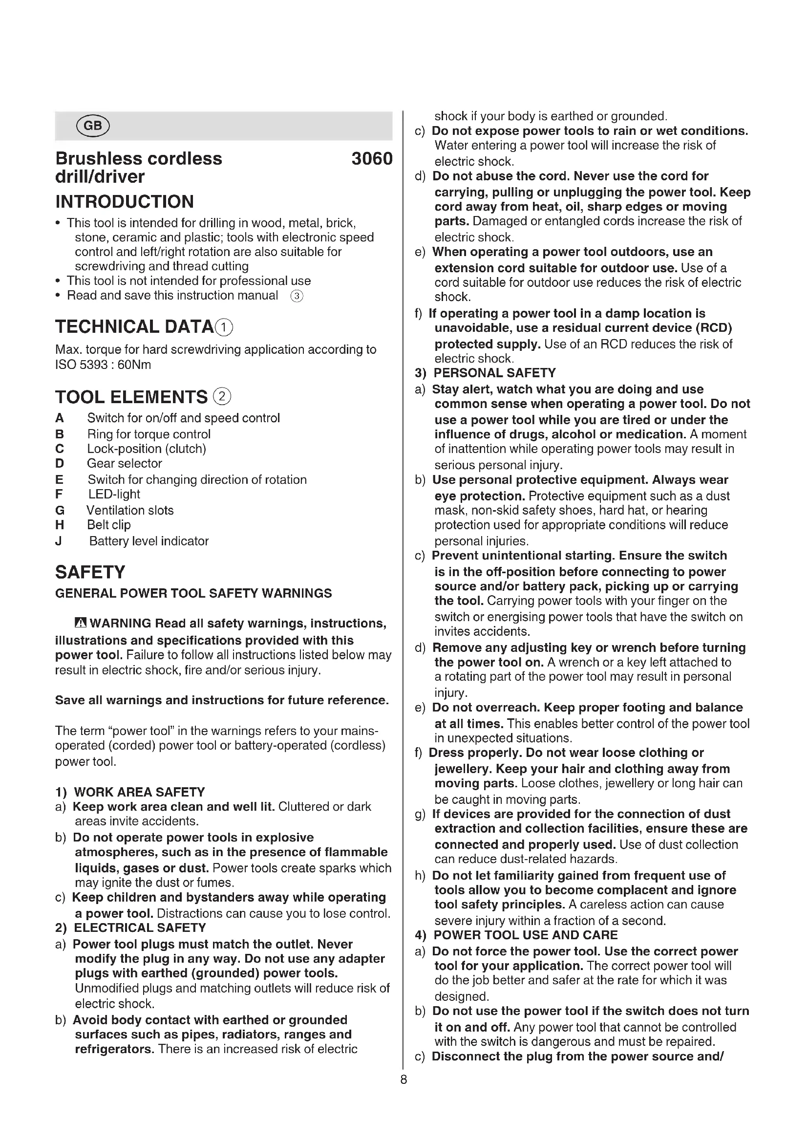 A Switch for on/o and speed control B Ring for torque control C Lock-position (clutch) D Gear selector E Switch for changing direction of rotation F LED-light G Ventilation slots H Belt clip J Battery level indicator SAFETY