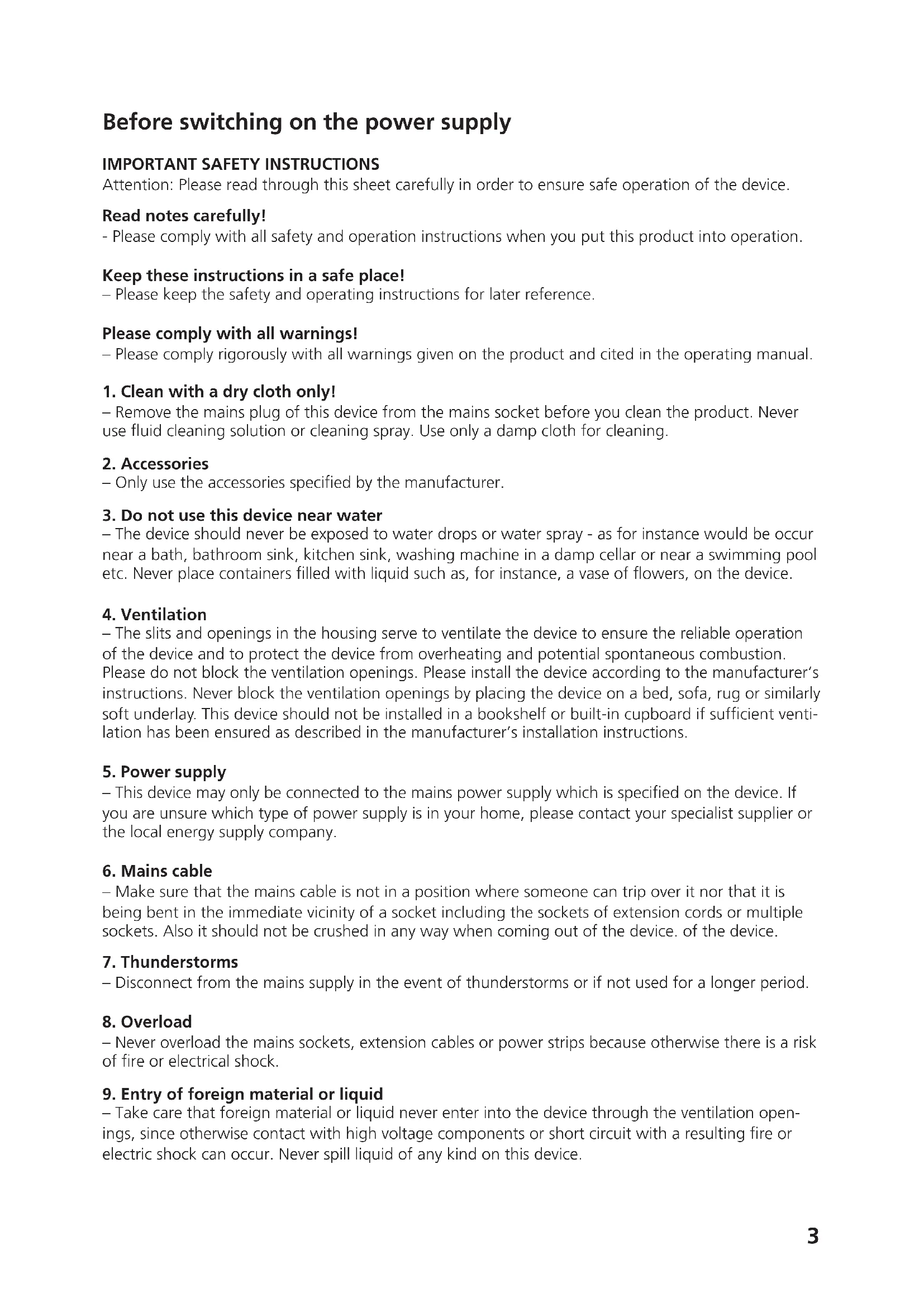 – Take care that foreign material or liquid never enter into the device through the ventilation open- ings,sinceotherwisecontactwithhighvoltagecomponentsorshortcircuitwitharesultingreor electric shock can occur. Never spill liquid of any kind on this device.