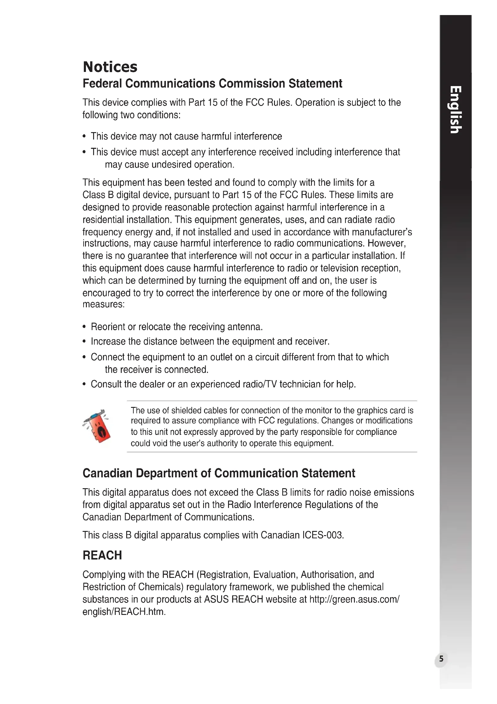 - Consult the dealer or an experienced radio/TV technician for help. Canadian Department of Communication Statement This digital apparatus does not exceed the Class B limits for radio noise emissions from digital apparatus set out in the Radio Interference Regulations of the Canadian Department of Communications. This class B digital apparatus complies with Canadian ICES-003. The use of shielded cables for connection of the monitor to the graphics card is required to assure compliance with FCC regulations. Changes or modications to this unit not expressly approved by the party responsible for compliance could void the user’s authority to operate this equipment. REACH Complying with the REACH (Registration, Evaluation, Authorisation, and Restriction of Chemicals) regulatory framework, we published the chemical substances in our products at ASUS REACH website at http://green.asus.com/ english/REACH.htm.English