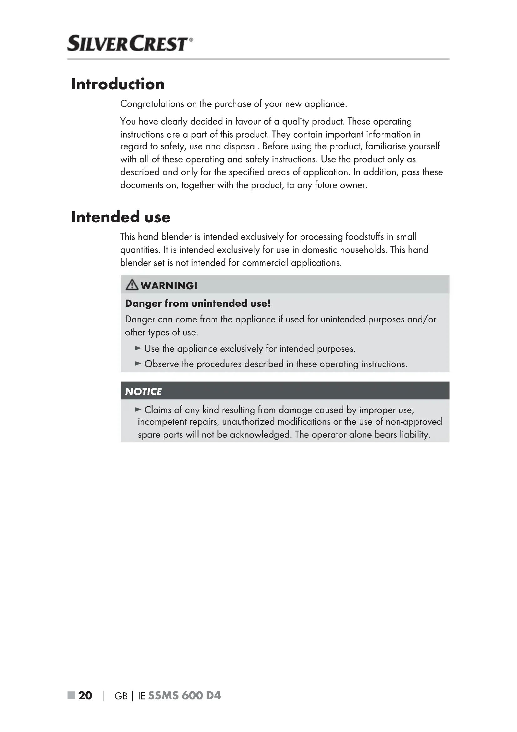 Introduction Congratulations on the purchase of your new appliance. You have clearly decided in favour of a quality product. These operating instructions are a part of this product. They contain important information in regard to safety, use and disposal. Before using the product, familiarise yourself with all of these operating and safety instructions. Use the product only as described and only for the specified areas of application. In addition, pass these documents on, together with the product, to any future owner. Intended use This hand blender is intended exclusively for processing foodstuffs in small quantities. It is intended exclusively for use in domestic households. This hand blender set is not intended for commercial applications. WARNING! Danger from unintended use! Danger can come from the appliance if used for unintended purposes and/or other types of use. ► Use the appliance exclusively for intended purposes. ► Observe the procedures described in these operating instructions. NOTICE ► Claims of any kind resulting from damage caused by improper use, incompetent repairs, unauthorized modifications or the use of non-approved spare parts will not be acknowledged. The operator alone bears liability.GB