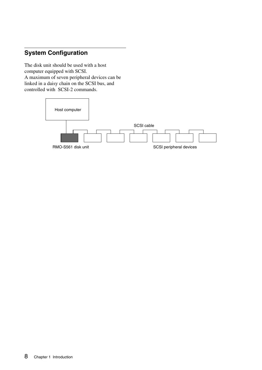 System Configuration The disk unit should be used with a host computer equipped with SCSI. A maximum of seven peripheral devices can be linked in a daisy chain on the SCSI bus, and controlled with SCSI-2 commands. Host computer SCSI cable RMO-S561 disk unit
