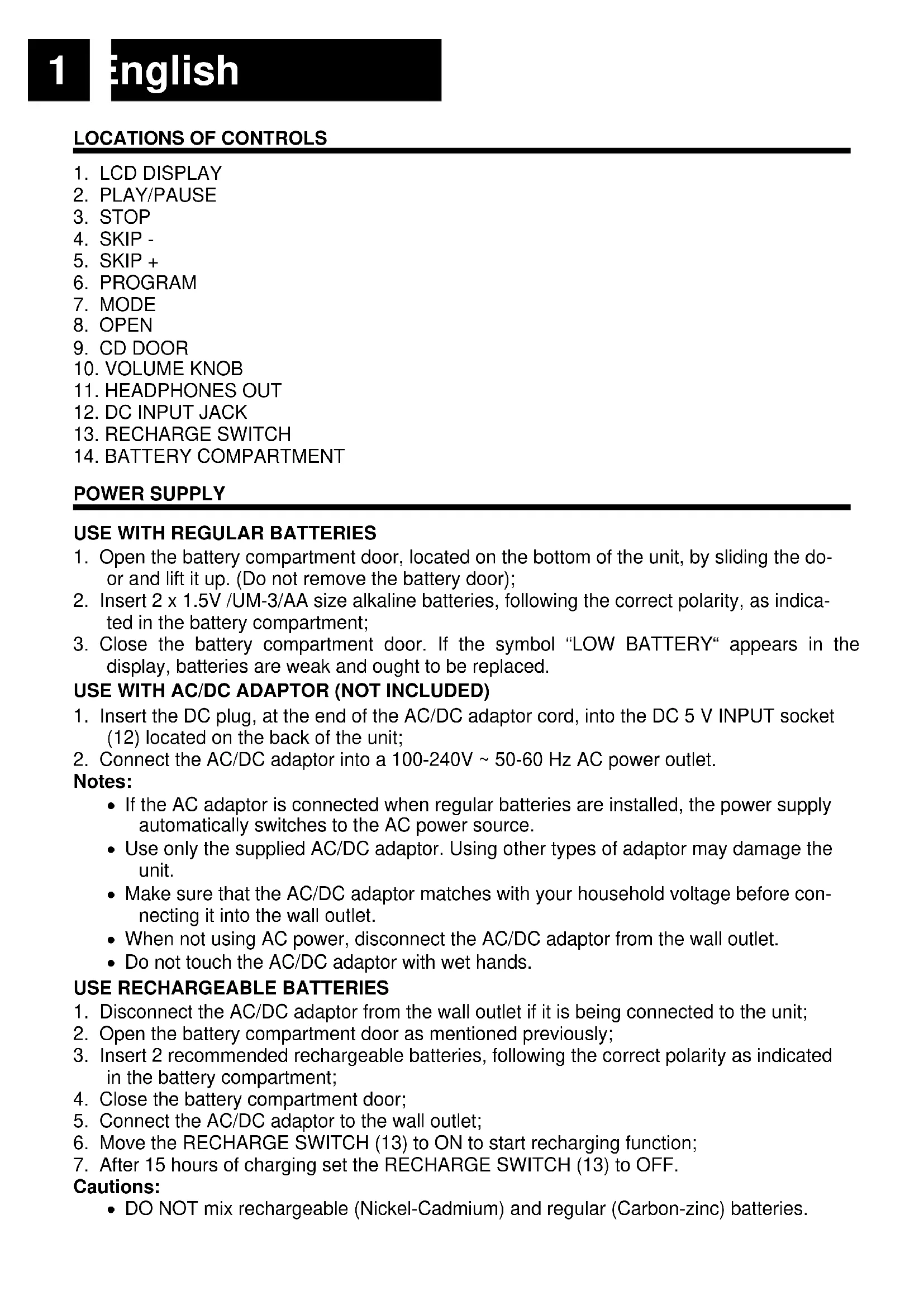 Cautions: DO NOT mix rechargeable (Nickel-Cadmium) and regular (Carbon-zinc) batteries.2