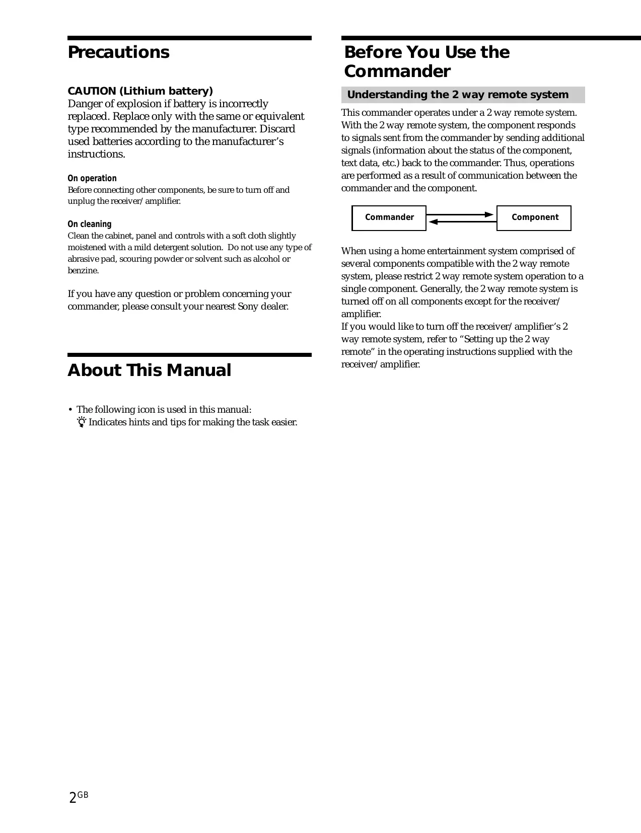 When using a home entertainment system comprised of several components compatible with the 2 way remote system, please restrict 2 way remote system operation to a single component. Generally, the 2 way remote system is turned off on all components except for the receiver/ amplifier.