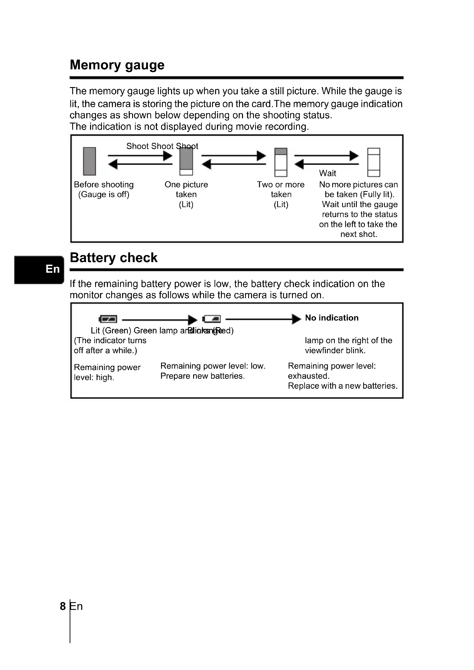 Memory gauge The memory gauge lights up when you take a still picture. While the gauge is lit, the camera is storing the picture on the card.The memory gauge indication changes as shown below depending on the shooting status. The indication is not displayed during movie recording. Battery check If the remaining battery power is low, the battery check indication on the monitor changes as follows while the camera is turned on. Before shooting (Gauge is off) No more pictures can be taken (Fully lit). Wait until the gauge returns to the status on the left to take the next shot. One picture taken (Lit) Two or more taken (Lit) Shoot Shoot Shoot Wait Lit (Green) Green lamp and orange lamp on the right of the viewfinder blink. Blinks (Red) No indication Remaining power level: exhausted. Replace with a new batteries. Remaining power level: low. Prepare new batteries. (The indicator turns off after a while.) Remaining power level: high. x215_Basic.book 8 ページ 2003年11月26日 水曜日 午後2時47分En 9