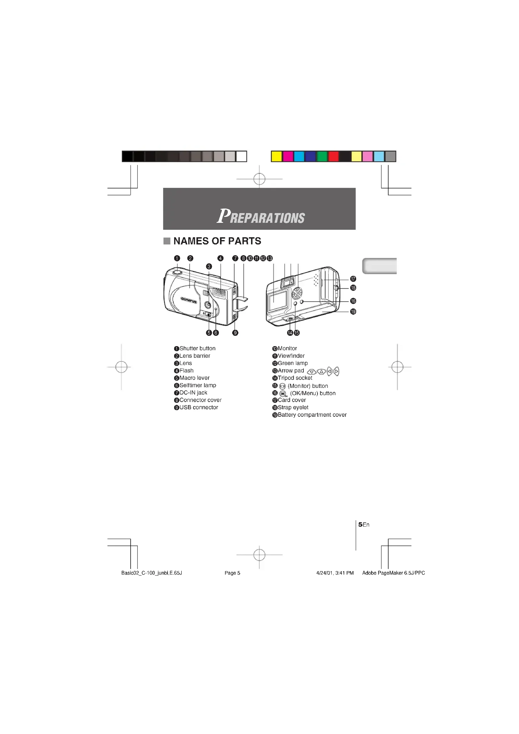 (OK/Menu) button G Card cover H Strap eyelet I Battery compartment cover Basic02C-100junbi,E.65J 4/24/01, 3:41 PMPage 5 AdobePageMaker6.5J/PPC6 En