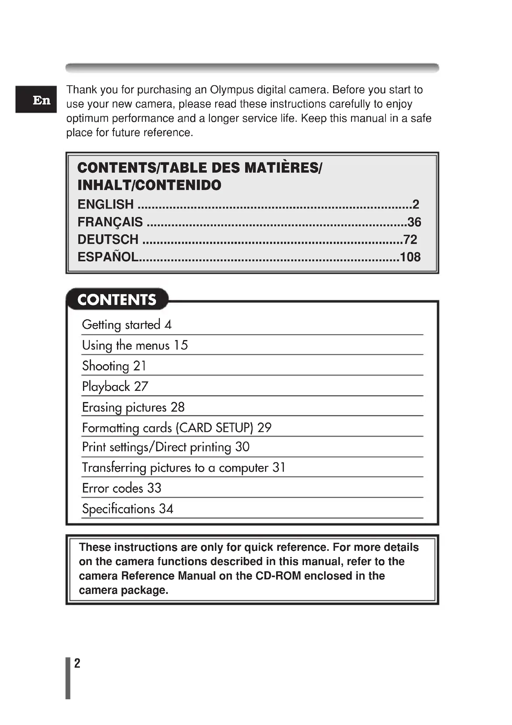 - ESPAÑOL Getting started 4 Using the menus 15 Shooting 21 Playback 27 Erasing pictures 28 Formatting cards (CARD SETUP) 29 Print settings/Direct printing 30 Transferring pictures to a computer 31 Error codes 33 Specifications 34 CONTENTS Thank you for purchasing an Olympus digital camera. Before you start to use your new camera, please read these instructions carefully to enjoy optimum performance and a longer service life. Keep this manual in a safe place for future reference. These instructions are only for quick reference. For more details on the camera functions described in this manual, refer to the camera Reference Manual on the CD-ROM enclosed in the camera package. 1 D395/C160_B-E1 2004.1.30 5:53 PM Page 2 (1,1)En p. 108