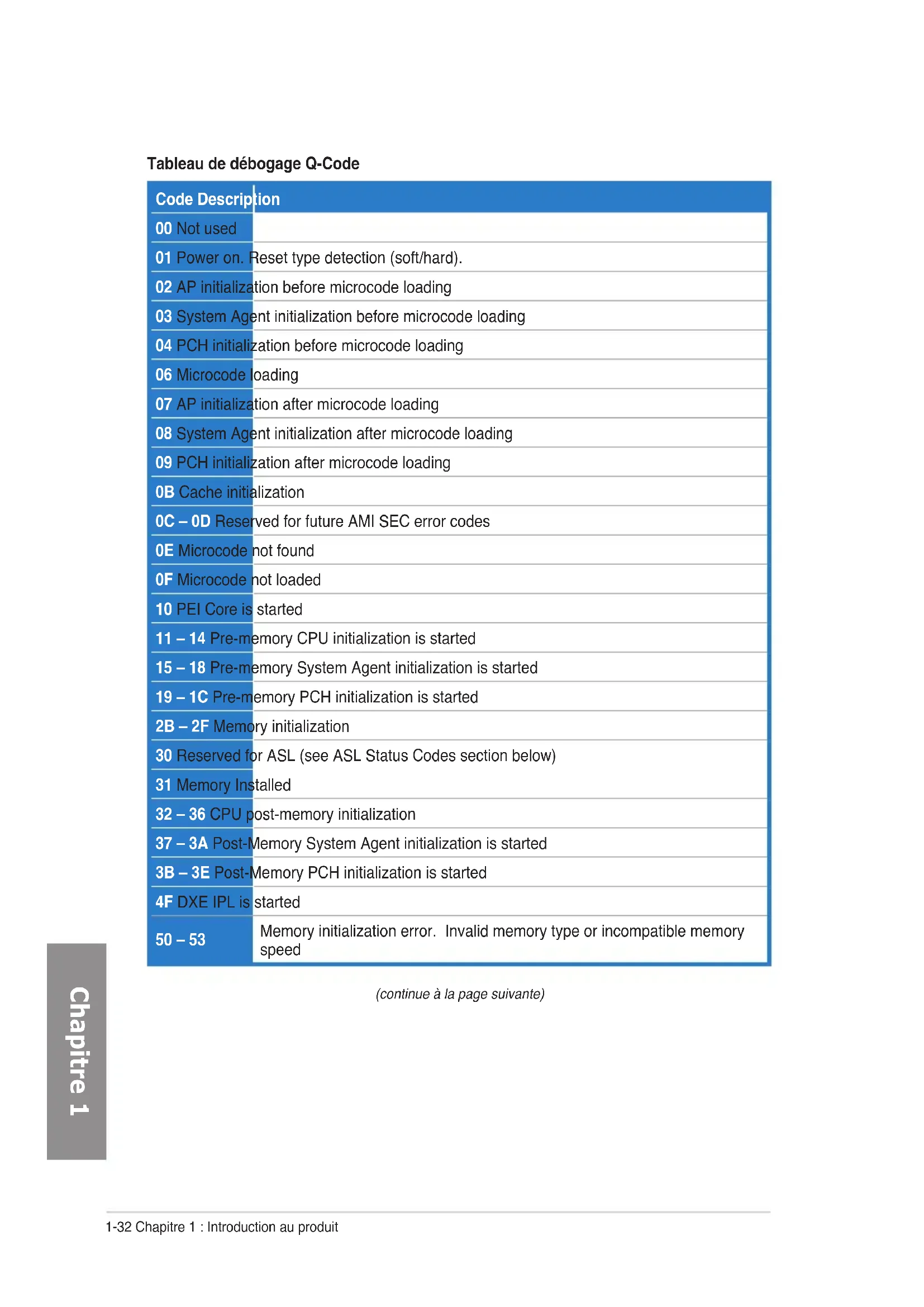 (continue à la page suivante) Code Description 54 Unspecied memory initialization error 55 Memory not installed 56 Invalid CPU type or Speed 57 CPU mismatch 58 CPU self test failed or possible CPU cache error 59 CPU micro-code is not found or micro-code update is failed 5A Internal CPU error 5B Reset PPI is not available 5C – 5F Reserved for future AMI error codes E0 S3 Resume is stared (S3 Resume PPI is called by the DXE IPL) E1 S3 Boot Script execution E2 Video repost E3 OS S3 wake vector call E4 – E7 Reserved for future AMI progress codes E8 S3 Resume Failed E9 S3 Resume PPI not Found EA S3 Resume Boot Script Error EB S3 OS Wake Error EC – EF Reserved for future AMI error codes F0 Recovery condition triggered by rmware (Auto recovery) F1 Recovery condition triggered by user (Forced recovery) F2 Recovery process started F3 Recovery rmware image is found F4 Recovery rmware image is loaded F5 – F7 Reserved for future AMI progress codes F8 Recovery PPI is not available1-34 Chapitre 1 : Introduction au produit