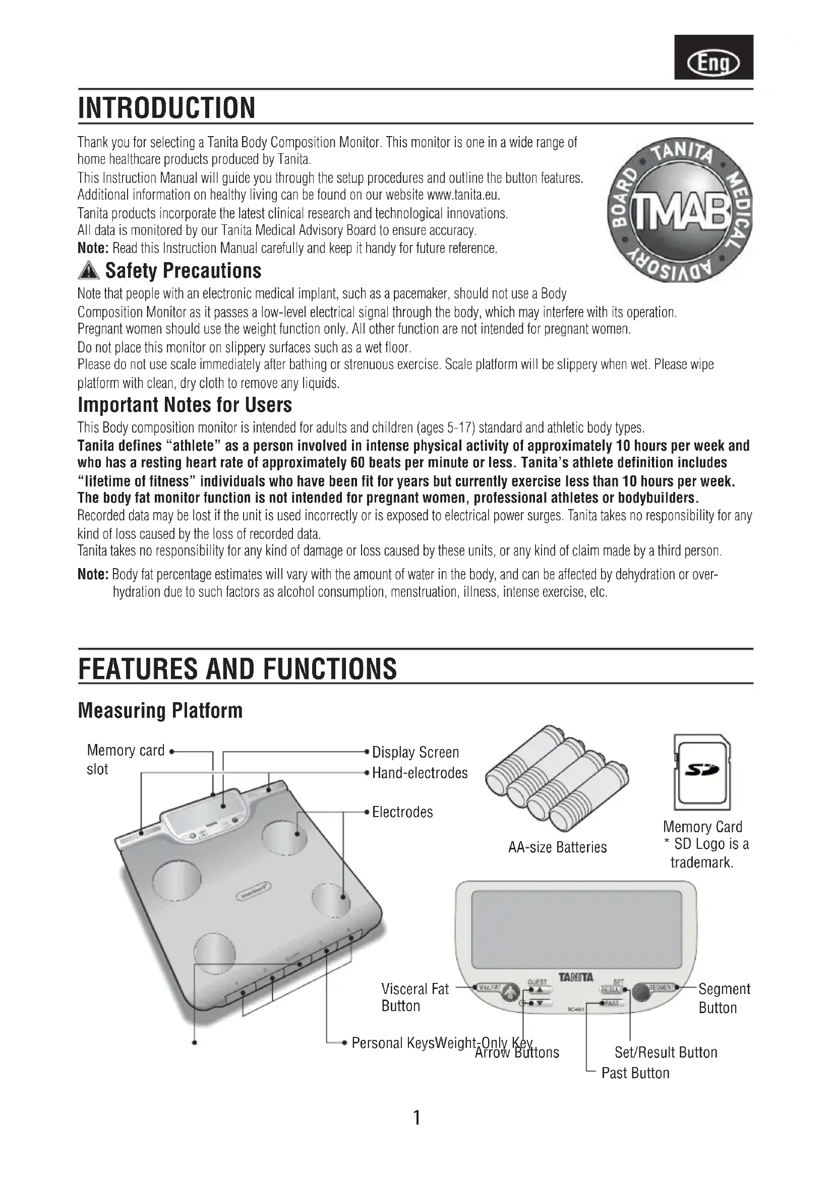 Измерение только веса тела .............................76 Переключение режима взвешивания ..............76 Поиск неисправностей .......................................771 Thank you for selecting a Tanita Body Composition Monitor. This monitor is one in a wide range of home healthcare products produced by Tanita. This Instruction Manual will guide you through the setup procedures and outline the button features. Additional information on healthy living can be found on our website www.tanita.eu. Tanita products incorporate the latest clinical research and technological innovations. All data is monitored by our Tanita Medical Advisory Board to ensure accuracy. Note: Read this Instruction Manual carefully and keep it handy for future reference. Safety Precautions Note that people with an electronic medical implant, such as a pacemaker, should not use a Body Composition Monitor as it passes a low-level electrical signal through the body, which may interfere with its operation. Pregnant women should use the weight function only. All other function are not intended for pregnant women. Do not place this monitor on slippery surfaces such as a wet floor. Please do not use scale immediately after bathing or strenuous exercise. Scale platform will be slippery when wet. Please wipe platform with clean, dry cloth to remove any liquids. Important Notes for Users This Body composition monitor is intended for adults and children (ages 5-17) standard and athletic body types. Tanita defines “athlete” as a person involved in intense physical activity of approximately 10 hours per week and who has a resting heart rate of approximately 60 beats per minute or less. Tanita’s athlete definition includes “lifetime of fitness” individuals who have been fit for years but currently exercise less than 10 hours per week. The body fat monitor function is not intended for pregnant women, professional athletes or bodybuilders. Recorded data may be lost if the unit is used incorrectly or is exposed to electrical power surges. Tanita takes no responsibility for any kind of loss caused by the loss of recorded data. Tanita takes no responsibility for any kind of damage or loss caused by these units, or any kind of claim made by a third person. Note: Body fat percentage estimates will vary with the amount of water in the body, and can be affected by dehydration or over- hydration due to such factors as alcohol consumption, menstruation, illness, intense exercise, etc. INTRODUCTION