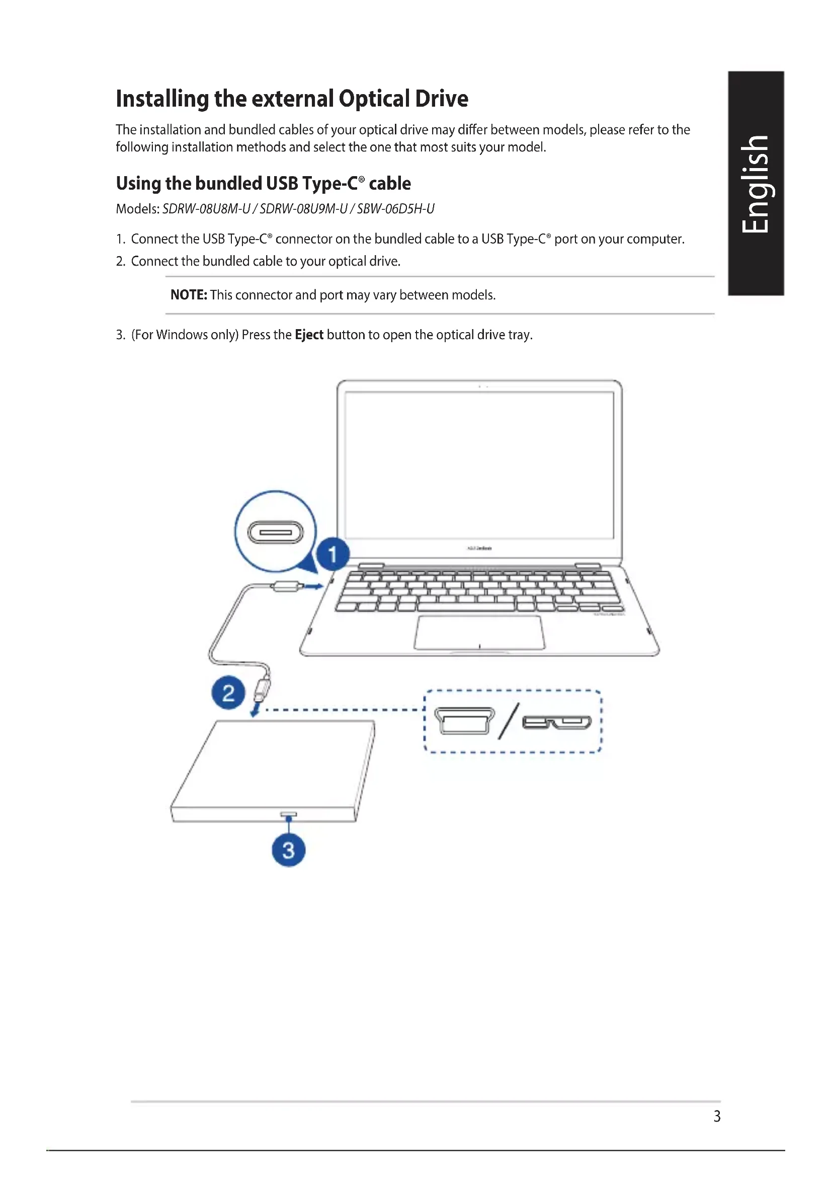 Installing the external Optical Drive English The installation and bundled cables of your optical drive may dier between models, please refer to the following installation methods and select the one that most suits your model.