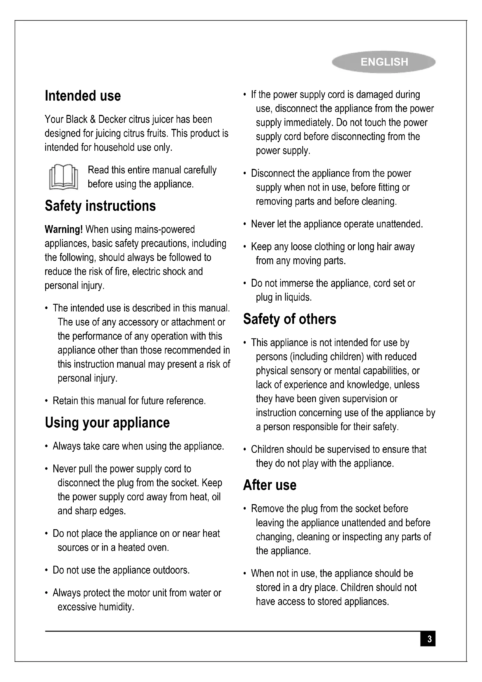 ENGLISH Intended use Your Black & Decker citrus juicer has been designed for juicing citrus fruits. This product is intended for household use only. Read this entire manual carefully before using the appliance. Safety instructions Warning! When using mains-powered appliances, basic safety precautions, including the following, should always be followed to reduce the risk of fire, electric shock and personal injury.