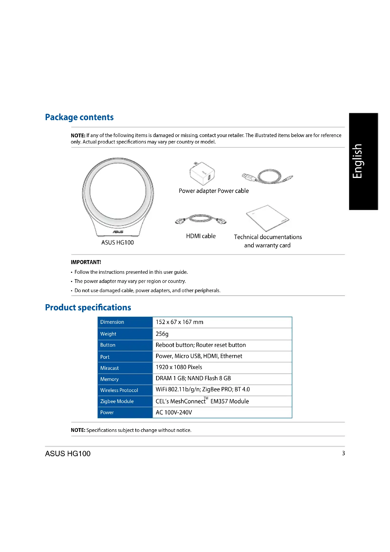 - Do not use damaged cable, power adapters, and other peripherals. Package contents NOTE: If any of the following items is damaged or missing, contact your retailer. The illustrated items below are for reference only. Actual product specications may vary per country or model. Product specications Dimension 152 x 67 x 167 mm Weight 256g Button Reboot button; Router reset button Port Power, Micro USB, HDMI, Ethernet Miracast 1920 x 1080 Pixels Memory DRAM 1 GB; NAND Flash 8 GB Wireless Protocol WiFi 802.11b/g/n; ZigBee PRO; BT 4.0 Zigbee Module CEL’s MeshConnect