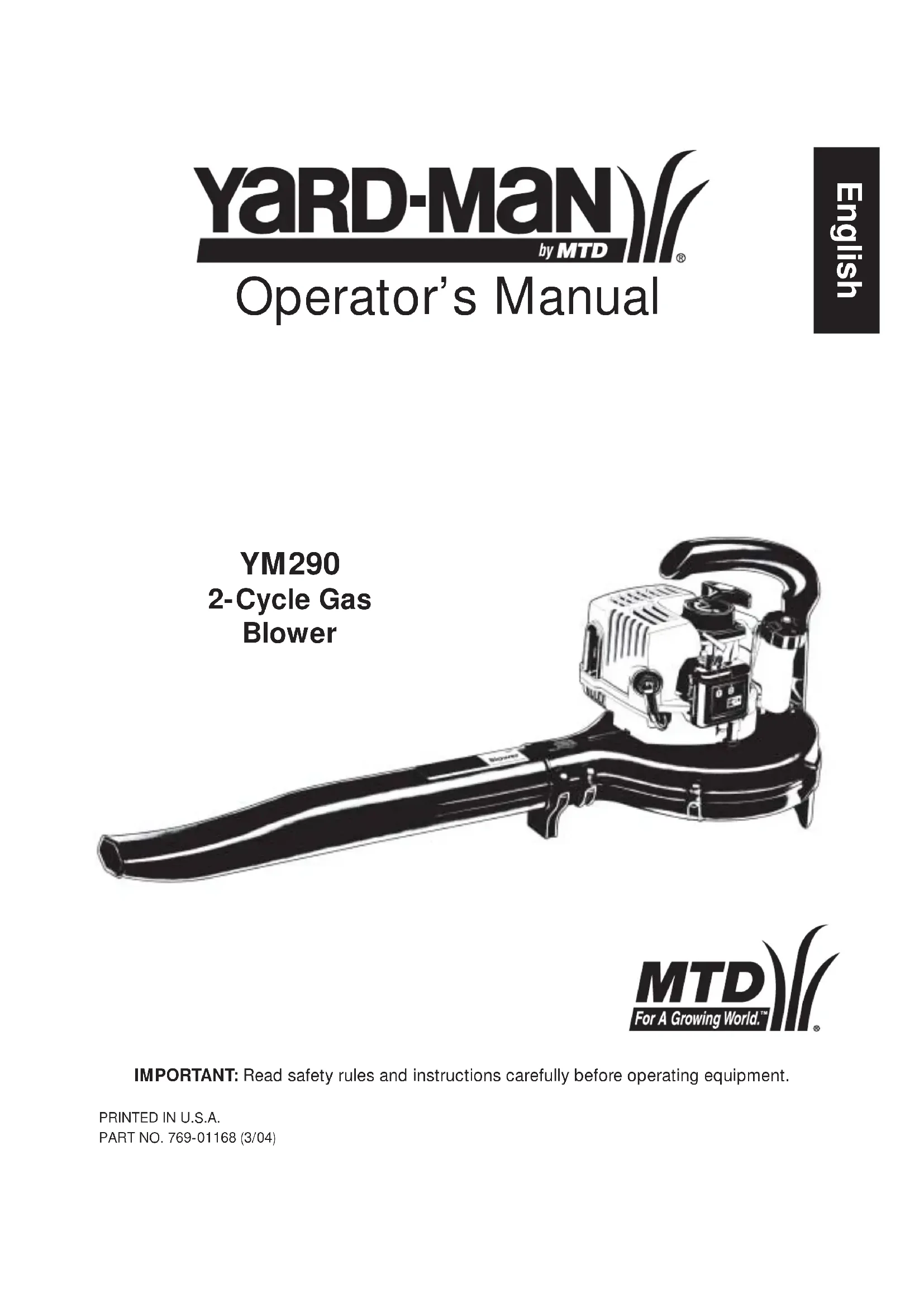 Operator’s Manual IMPORTANT: Read safety rules and instructions carefully before operating equipment. PRINTED IN U.S.A.PART NO. 769-01168 (3/04) English YM290 2-Cycle Gas Blower2 INTRODUCTION Copy the serial number here: THANK YOU Thank you for buying this quality product. This modern outdoor power tool will provide many hours of useful service. You will find it to be a great labor-saving device. This operator’s manual provides you with easy-to- understand operating instructions. Read the whole manual and follow all the instructions to keep your new outdoor power tool in top operating condition.