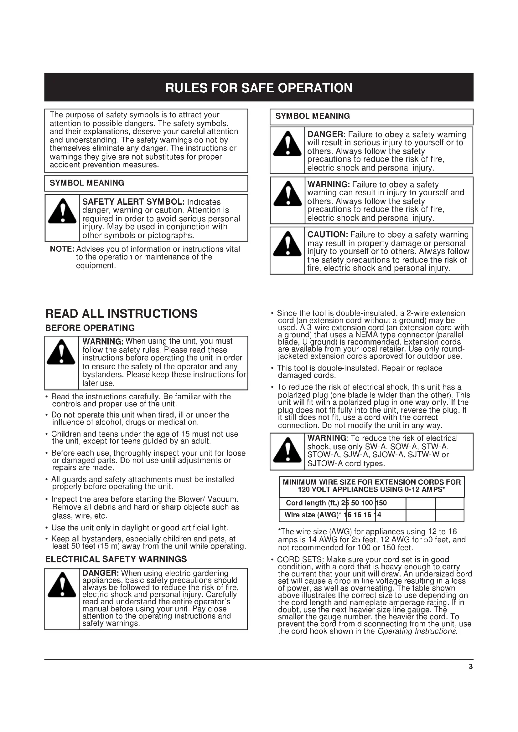 When using the unit, you must follow the safety rules. Please read these instructions before operating the unit in order to ensure the safety of the operator and any bystanders. Please keep these instructions for later use. Cord length (ft.) 25 50 100 150Wire size (AWG)* 16 16 16 14MINIMUM WIRE SIZE FOR EXTENSION CORDS FOR120 VOLT APPLIANCES USING 0-12 AMPS*