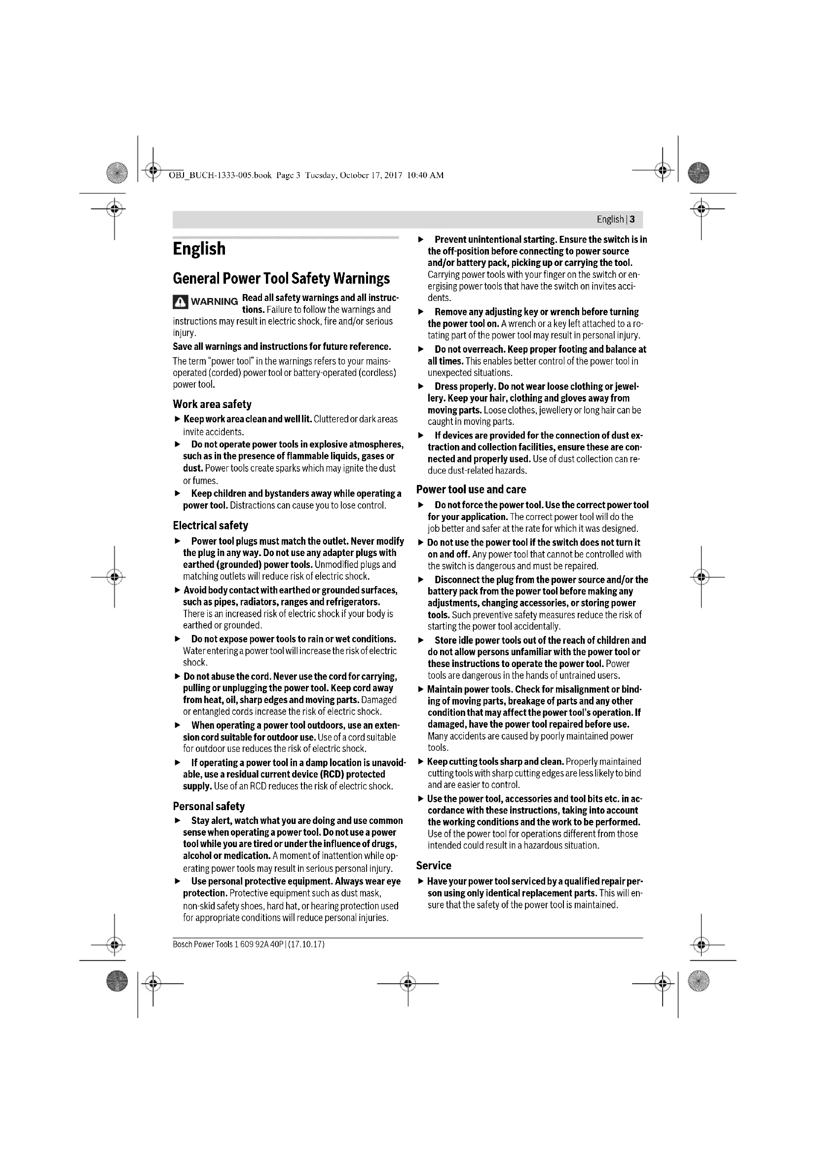 OBJ_BUCH-1333-005.book Page 2 Tuesday, October 17, 2017 10:40 AMEnglish | 3 Bosch Power Tools 1 609 92A 40P | (17.10.17) English General Power Tool Safety Warnings Read all safety warnings and all instruc- tions. Failure to follow the warnings and instructions may result in electric shock, fire and/or serious injury. Save all warnings and instructions for future reference. The term “power tool” in the warnings refers to your mains- operated (corded) power tool or battery-operated (cordless) power tool. Work area safety Keep work area clean and well lit. Cluttered or dark areas invite accidents. Do not operate power tools in explosive atmospheres, such as in the presence of flammable liquids, gases or dust. Power tools create sparks which may ignite the dust or fumes. Keep children and bystanders away while operating a power tool. Distractions can cause you to lose control. Electrical safety Power tool plugs must match the outlet. Never modify the plug in any way. Do not use any adapter plugs with earthed (grounded) power tools. Unmodified plugs and matching outlets will reduce risk of electric shock. Avoid body contact with earthed or grounded surfaces, such as pipes, radiators, ranges and refrigerators. There is an increased risk of electric shock if your body is earthed or grounded. Do not expose power tools to rain or wet conditions. Water entering a power tool will increase the risk of electric shock. Do not abuse the cord. Never use the cord for carrying, pulling or unplugging the power tool. Keep cord away from heat, oil, sharp edges and moving parts. Damaged or entangled cords increase the risk of electric shock. When operating a power tool outdoors, use an exten- sion cord suitable for outdoor use. Use of a cord suitable for outdoor use reduces the risk of electric shock. If operating a power tool in a damp location is unavoid- able, use a residual current device (RCD) protected supply. Use of an RCD reduces the risk of electric shock. Personal safety Stay alert, watch what you are doing and use common sense when operating a power tool. Do not use a power tool while you are tired or under the influence of drugs, alcohol or medication. A moment of inattention while op- erating power tools may result in serious personal injury. Use personal protective equipment. Always wear eye protection. Protective equipment such as dust mask, non-skid safety shoes, hard hat, or hearing protection used for appropriate conditions will reduce personal injuries. Prevent unintentional starting. Ensure the switch is in the off-position before connecting to power source and/or battery pack, picking up or carrying the tool. Carrying power tools with your finger on the switch or en- ergising power tools that have the switch on invites acci- dents. Remove any adjusting key or wrench before turning the power tool on. A wrench or a key left attached to a ro- tating part of the power tool may result in personal injury. Do not overreach. Keep proper footing and balance at all times. This enables better control of the power tool in unexpected situations. Dress properly. Do not wear loose clothing or jewel- lery. Keep your hair, clothing and gloves away from moving parts. Loose clothes, jewellery or long hair can be caught in moving parts. If devices are provided for the connection of dust ex- traction and collection facilities, ensure these are con- nected and properly used. Use of dust collection can re- duce dust-related hazards. Power tool use and care Do not force the power tool. Use the correct power tool for your application. The correct power tool will do the job better and safer at the rate for which it was designed. Do not use the power tool if the switch does not turn it on and off. Any power tool that cannot be controlled with the switch is dangerous and must be repaired. Disconnect the plug from the power source and/or the battery pack from the power tool before making any adjustments, changing accessories, or storing power tools. Such preventive safety measures reduce the risk of starting the power tool accidentally. Store idle power tools out of the reach of children and do not allow persons unfamiliar with the power tool or these instructions to operate the power tool. Power tools are dangerous in the hands of untrained users. Maintain power tools. Check for misalignment or bind- ing of moving parts, breakage of parts and any other condition that may affect the power tool’s operation. If damaged, have the power tool repaired before use. Many accidents are caused by poorly maintained power tools. Keep cutting tools sharp and clean. Properly maintained cutting tools with sharp cutting edges are less likely to bind and are easier to control. Use the power tool, accessories and tool bits etc. in ac- cordance with these instructions, taking into account the working conditions and the work to be performed. Use of the power tool for operations different from those intended could result in a hazardous situation. Service Have your power tool serviced by a qualified repair per- son using only identical replacement parts. This will en- sure that the safety of the power tool is maintained. WARNING OBJ_BUCH-1333-005.book Page 3 Tuesday, October 17, 2017 10:40 AM4 | English 1 609 92A 40P | (17.10.17) Bosch Power Tools Hammer Safety Warnings Wear ear protectors. Exposure to noise can cause hear- ing loss. Use auxiliary handle(s), if supplied with the tool. Loss of control can cause personal injury. Hold the tool by the insulated gripping surfaces when performing operations where the application tool or the screw could contact hidden wiring or its own power cord. Contact with a “live” wire will also make exposed metal parts of the power tool “live” and shock the operator. Additional Safety and Working In- structions Observe correct mains voltage! The voltage of the pow- er source must agree with the voltage specified on the nameplate of the machine. Power tools marked with 230 V can also be operat