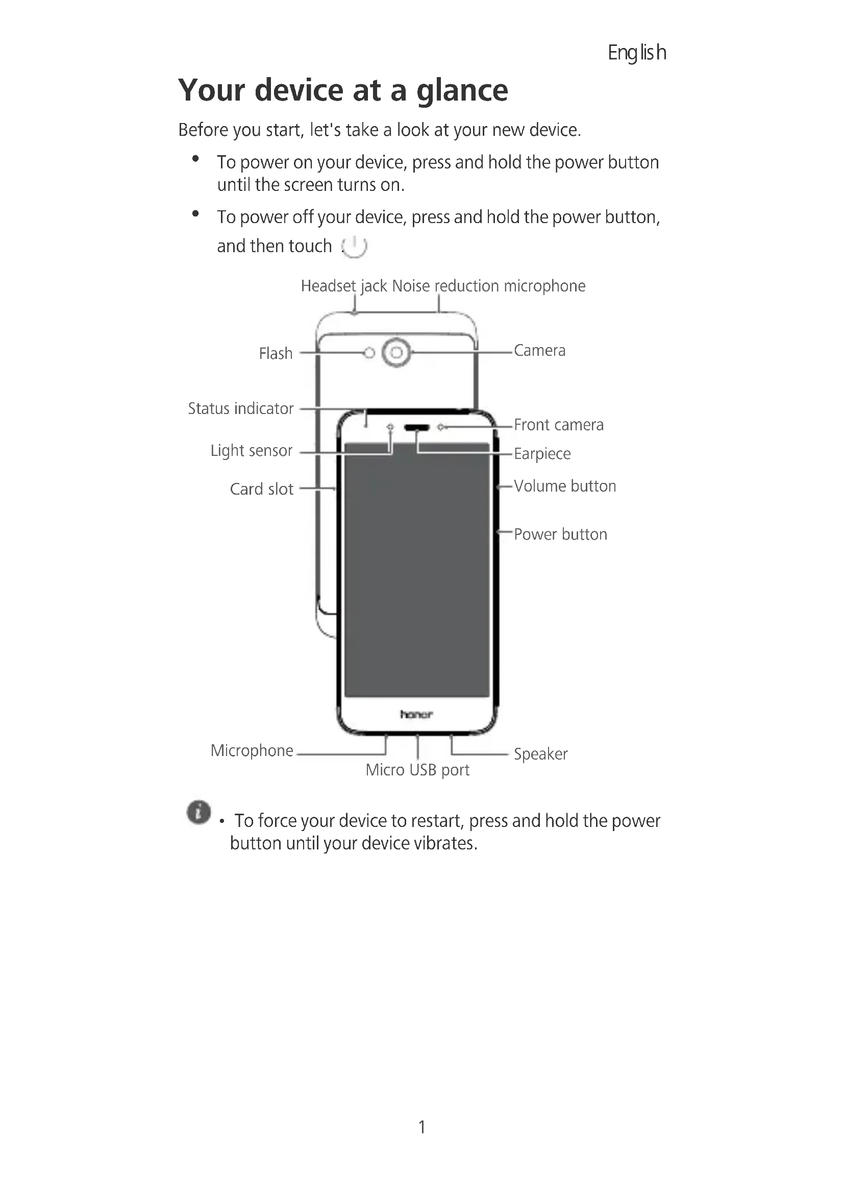 - To force your device to restart, press and hold the power button until your device vibrates. Headset jack Noise reduction microphone Camera Earpiece Front camera Volume button Power button Microphone Micro USB port Speaker Status indicator Light sensor Flash Card slot