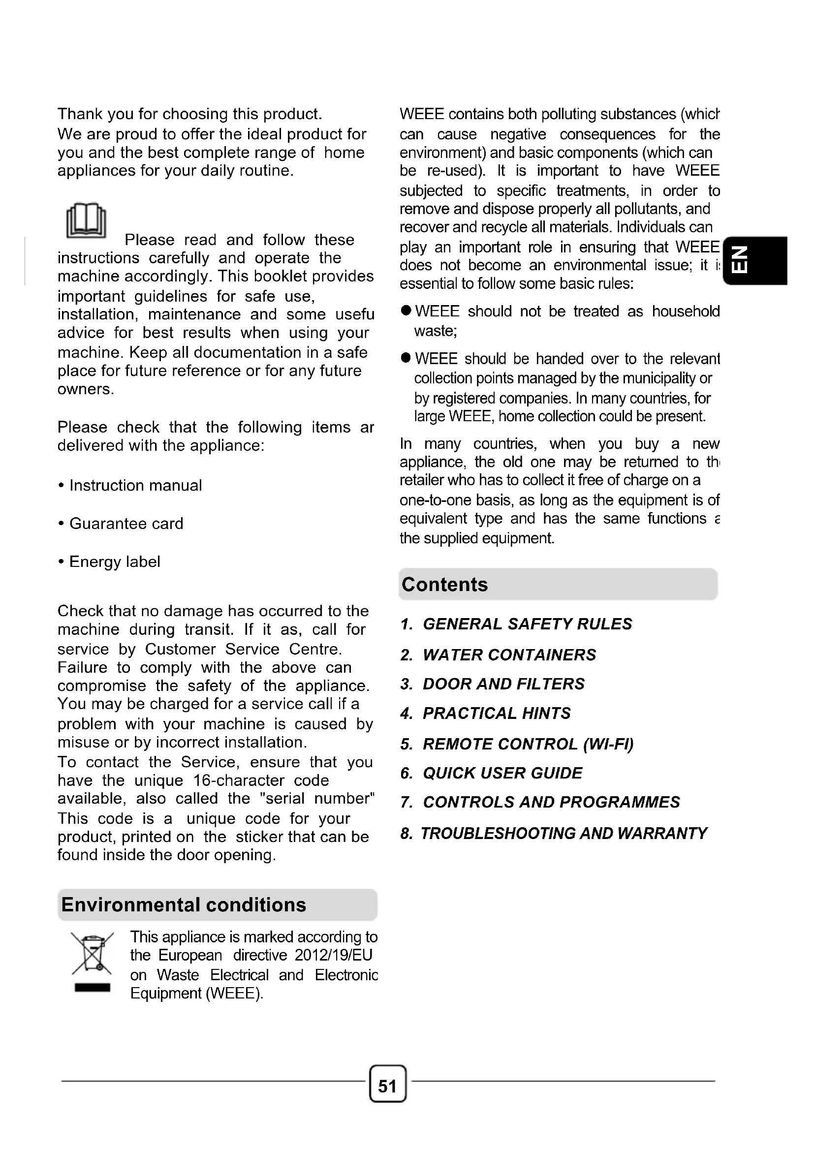 Thank you for choosing this product. We are proud to offer the ideal product for you and the best complete range of home appliances for your daily routine. Please read and follow these instructions carefully and operate the machine accordingly. This booklet provides important guidelines for safe use, installation, maintenance and some useful advice for best results when using your machine. Keep all documentation in a safe place for future reference or for any future owners. Please check that the following items are delivered with the appliance: