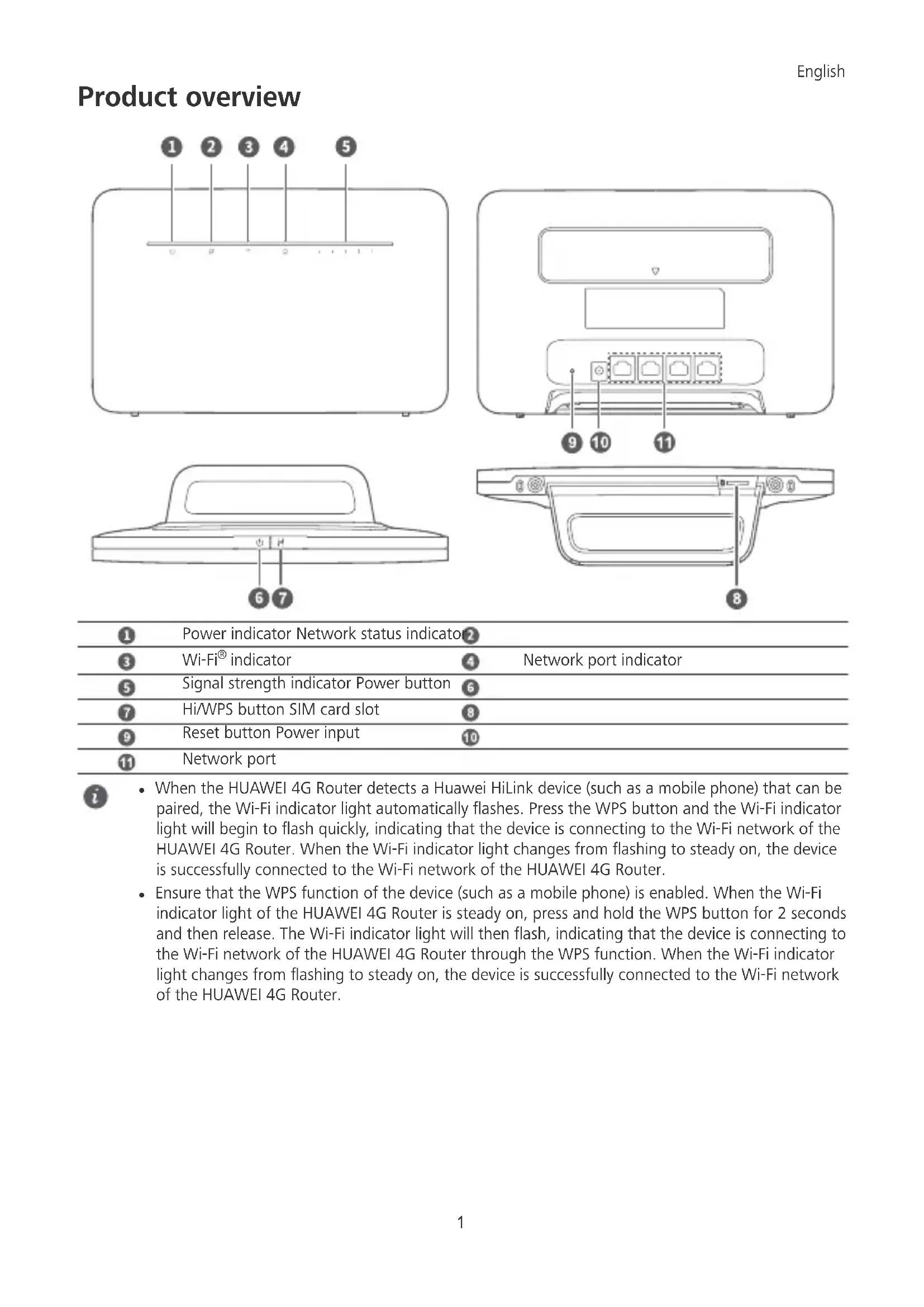 indicator Network port indicator Signal strength indicator Power button Hi/WPS button SIM card slot Reset button Power input Network port l When the HUAWEI 4G Router detects a Huawei HiLink device (such as a mobile phone) that can be paired, the Wi-Fi indicator light automatically ashes. Press the WPS button and the Wi-Fi indicator light will begin to ash quickly, indicating that the device is connecting to the Wi-Fi network of the HUAWEI 4G Router. When the Wi-Fi indicator light changes from ashing to steady on, the device is successfully connected to the Wi-Fi network of the HUAWEI 4G Router. l Ensure that the WPS function of the device (such as a mobile phone) is enabled. When the Wi-Fi indicator light of the HUAWEI 4G Router is steady on, press and hold the WPS button for 2 seconds and then release. The Wi-Fi indicator light will then ash, indicating that the device is connecting to the Wi-Fi network of the HUAWEI 4G Router through the WPS function. When the Wi-Fi indicator light changes from ashing to steady on, the device is successfully connected to the Wi-Fi network of the HUAWEI 4G Router. English 1Setup 1 Attach the socket to the router.