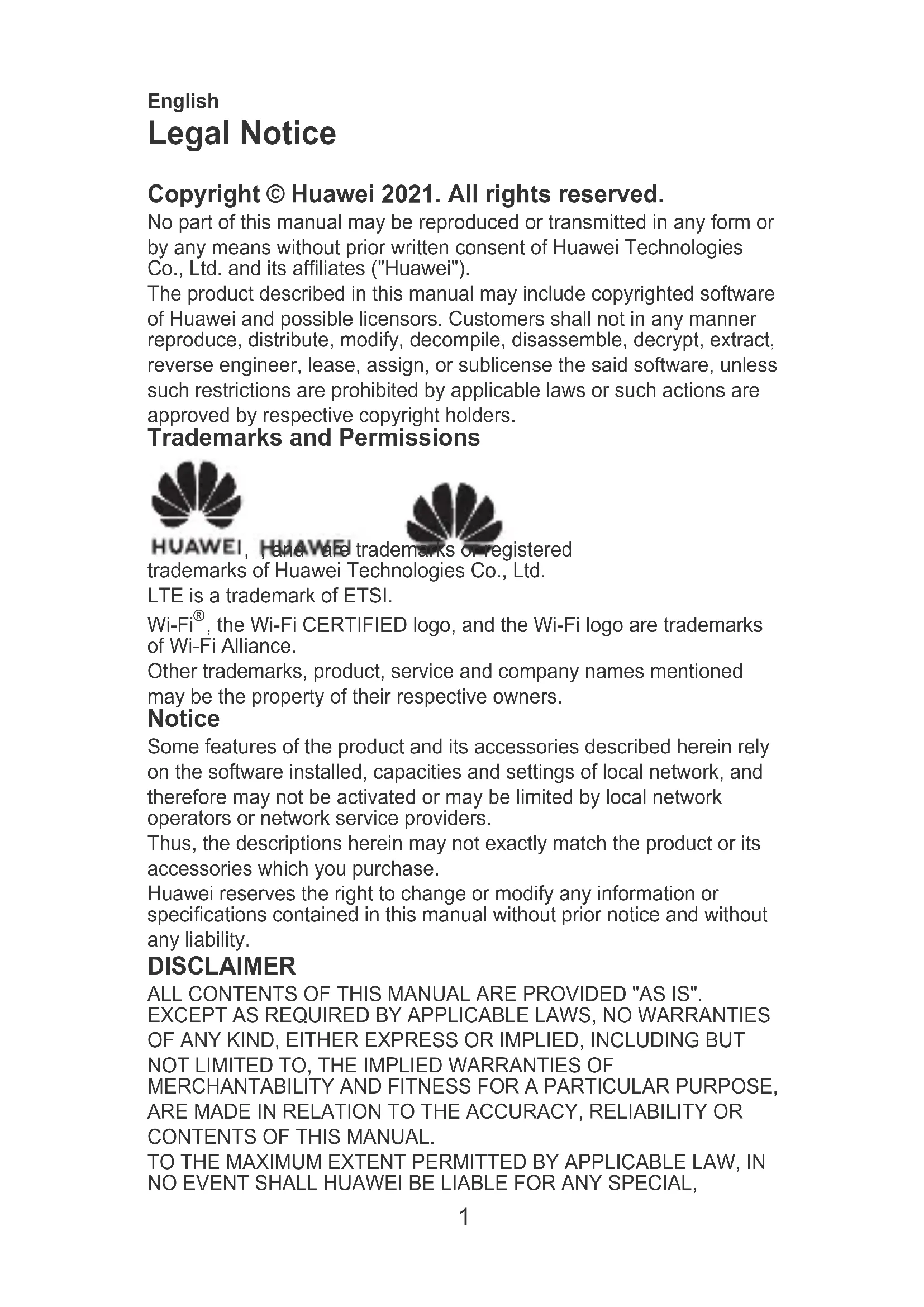 , the Wi-Fi CERTIFIED logo, and the Wi-Fi logo are trademarks of Wi-Fi Alliance. Other trademarks, product, service and company names mentioned may be the property of their respective owners. Notice Some features of the product and its accessories described herein rely on the software installed, capacities and settings of local network, and therefore may not be activated or may be limited by local network operators or network service providers. Thus, the descriptions herein may not exactly match the product or its accessories which you purchase. Huawei reserves the right to change or modify any information or specifications contained in this manual without prior notice and without any liability. DISCLAIMER ALL CONTENTS OF THIS MANUAL ARE PROVIDED "AS IS". EXCEPT AS REQUIRED BY APPLICABLE LAWS, NO WARRANTIES OF ANY KIND, EITHER EXPRESS OR IMPLIED, INCLUDING BUT NOT LIMITED TO, THE IMPLIED WARRANTIES OF MERCHANTABILITY AND FITNESS FOR A PARTICULAR PURPOSE, ARE MADE IN RELATION TO THE ACCURACY, RELIABILITY OR CONTENTS OF THIS MANUAL. TO THE MAXIMUM EXTENT PERMITTED BY APPLICABLE LAW, IN NO EVENT SHALL HUAWEI BE LIABLE FOR ANY SPECIAL,