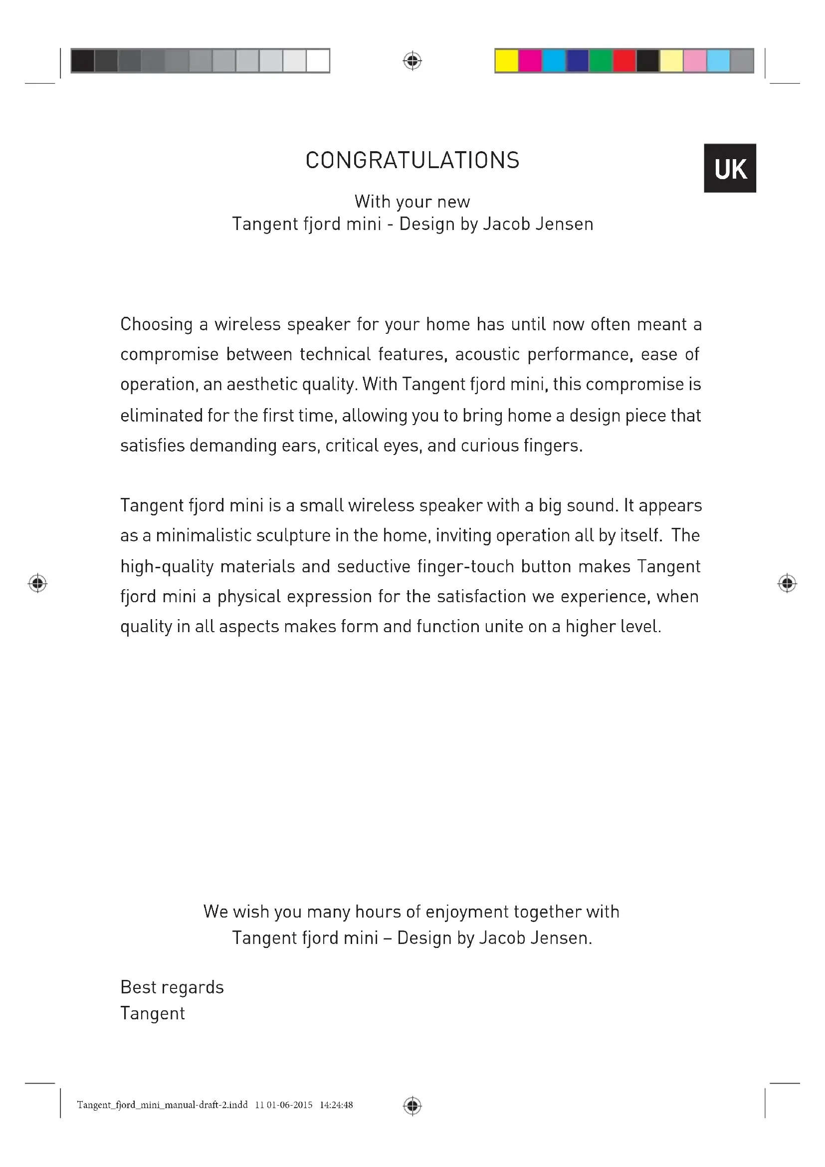 teriet, bring enheden til et autoriseret servicecenter for hjælp. Tangent_fjord_mini_manual-draft-2.indd 10 01-06-2015 14:24:48UK We wish you many hours of enjoyment together with Tangent fjord mini – Design by Jacob Jensen. Best regards Tangent CONGRATULATIONS With your new Tangent fjord mini - Design by Jacob Jensen Choosing a wireless speaker for your home has until now often meant a compromise between technical features, acoustic performance, ease of operation, an aesthetic quality. With Tangent fjord mini, this compromise is eliminated for the first time, allowing you to bring home a design piece that satisfies demanding ears, critical eyes, and curious fingers. Tangent fjord mini is a small wireless speaker with a big sound. It appears as a minimalistic sculpture in the home, inviting operation all by itself. The high-quality materials and seductive finger-touch button makes Tangent fjord mini a physical expression for the satisfaction we experience, when quality in all aspects makes form and function unite on a higher level. Tangent_fjord_mini_manual-draft-2.indd 11 01-06-2015 14:24:48Quick start guide: Unpack your Tangent fjord Switch the ON/OFF at the bottom to ON, for activating the touch sensor at the top of the unit. Power the unit ON by using a short press at the touch sensor The unit will now go into pairing mode and you can find it at your smart phone. (“If your smart phone has NFC and it is enabled you can use that for pairing” NFC is located at the top of the unit.) You are now connected with your device and can play music. For power OFF the fjord mini, you must use a long press at the touch sensor. Charge your Tangent fjord when needed. Touch key functions: Turn on Short press Turn off Long press (in operating mode and pairing mode) Volume up Slow press (tap x 1) when playing music Volume down Fast press (multiple tapping) when playing music Cancel pairing list Double press in pairing mode Answer call Short press when incoming call Reject call Long press when incoming call End call Short press when calling Accept call waiting Double press when call waiting LED : White Power White flashing BT pairing Red Charge indication (OFF when charge is over) Red flashing Battery is low Tangent_fjord_mini_manual-draft-2.indd 12 01-06-2015 14:24:48UK