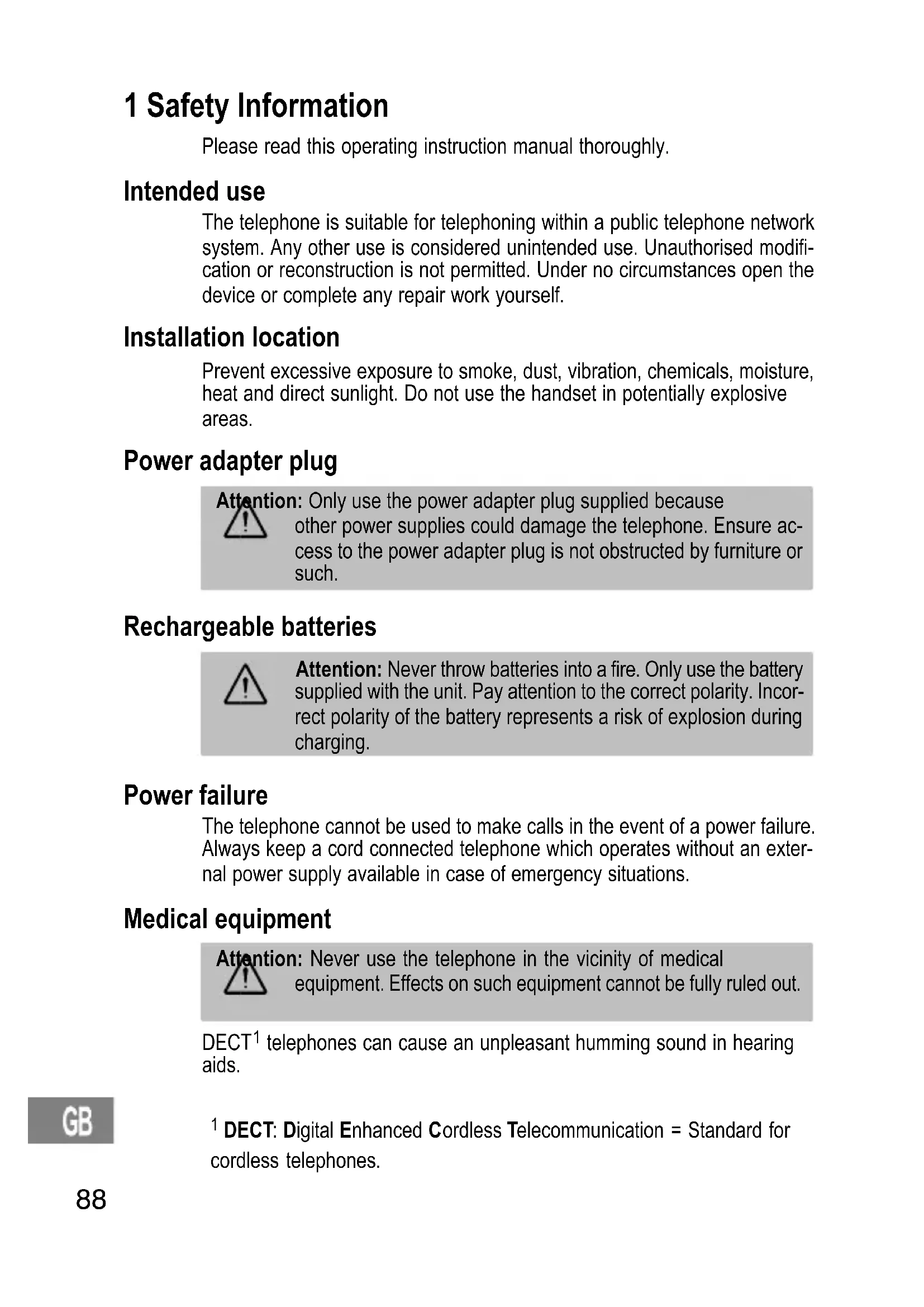 - Guarantee 111 1 Safety Information Please read this operating instruction manual thoroughly. Intended use The telephone is suitable for telephoning within a public telephone network system. Any other use is considered unintended use. Unauthorised modifi- cation or reconstruction is not permitted. Under no circumstances open the device or complete any repair work yourself. Installation location Prevent excessive exposure to smoke, dust, vibration, chemicals, moisture, heat and direct sunlight. Do not use the handset in potentially explosive areas. Power adapter plug Attention: Only use the power adapter plug supplied because other power supplies could damage the telephone. Ensure ac- cess to the power adapter plug is not obstructed by furniture or such. Rechargeable batteries Attention: Never throw batteries into a fire. Only use the battery supplied with the unit. Pay attention to the correct polarity. Incor- rect polarity of the battery represents a risk of explosion during charging. Power failure The telephone cannot be used to make calls in the event of a power failure. Always keep a cord connected telephone which operates without an exter- nal power supply available in case of emergency situations. Medical equipment Attention: Never use the telephone in the vicinity of medical equipment. Effects on such equipment cannot be fully ruled out. DECT p. 88