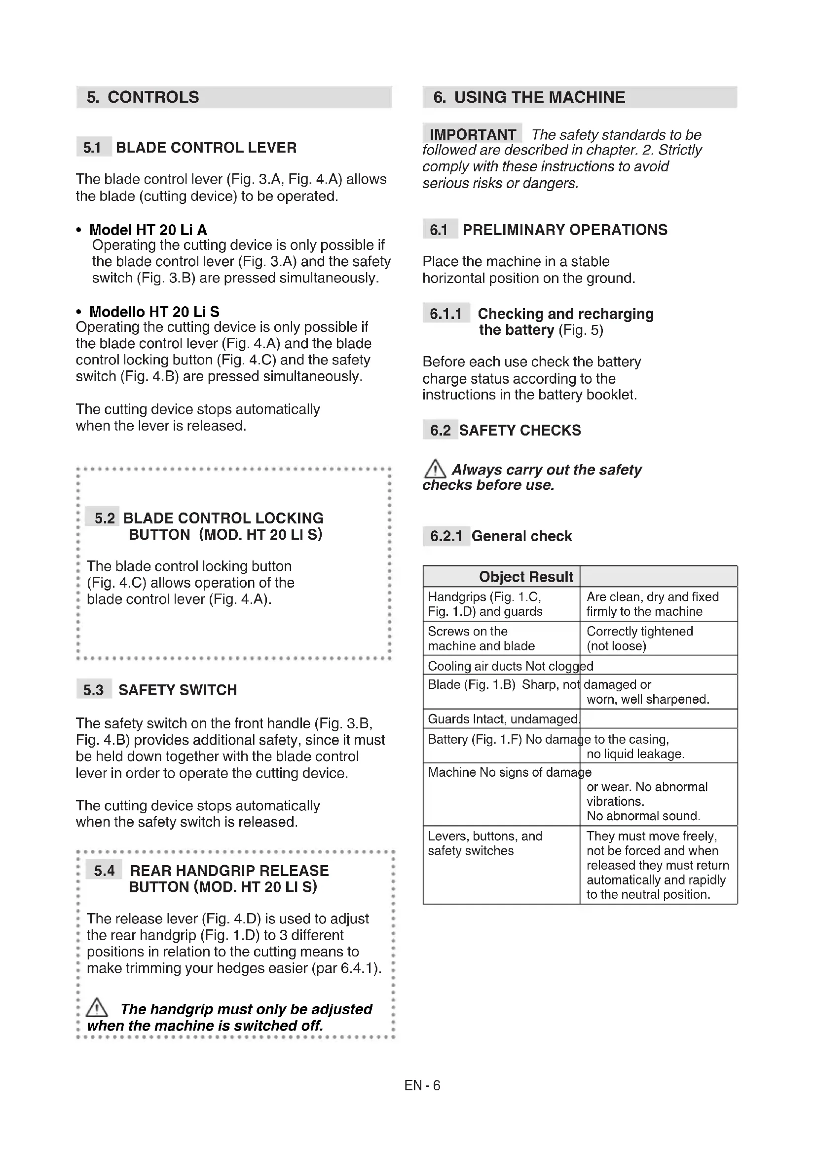 Object Result Handgrips (Fig. 1.C, Fig. 1.D) and guards Are clean, dry and xed rmly to the machine Screws on the machine and blade Correctly tightened (not loose) Cooling air ducts Not clogged Blade (Fig. 1.B) Sharp, not damaged or worn, well sharpened. Guards Intact, undamaged. Battery (Fig. 1.F) No damage to the casing, no liquid leakage. Machine No signs of damage or wear. No abnormal vibrations. No abnormal sound. Levers, buttons, and safety switches They must move freely, not be forced and when released they must return automatically and rapidly to the neutral position.EN - 7