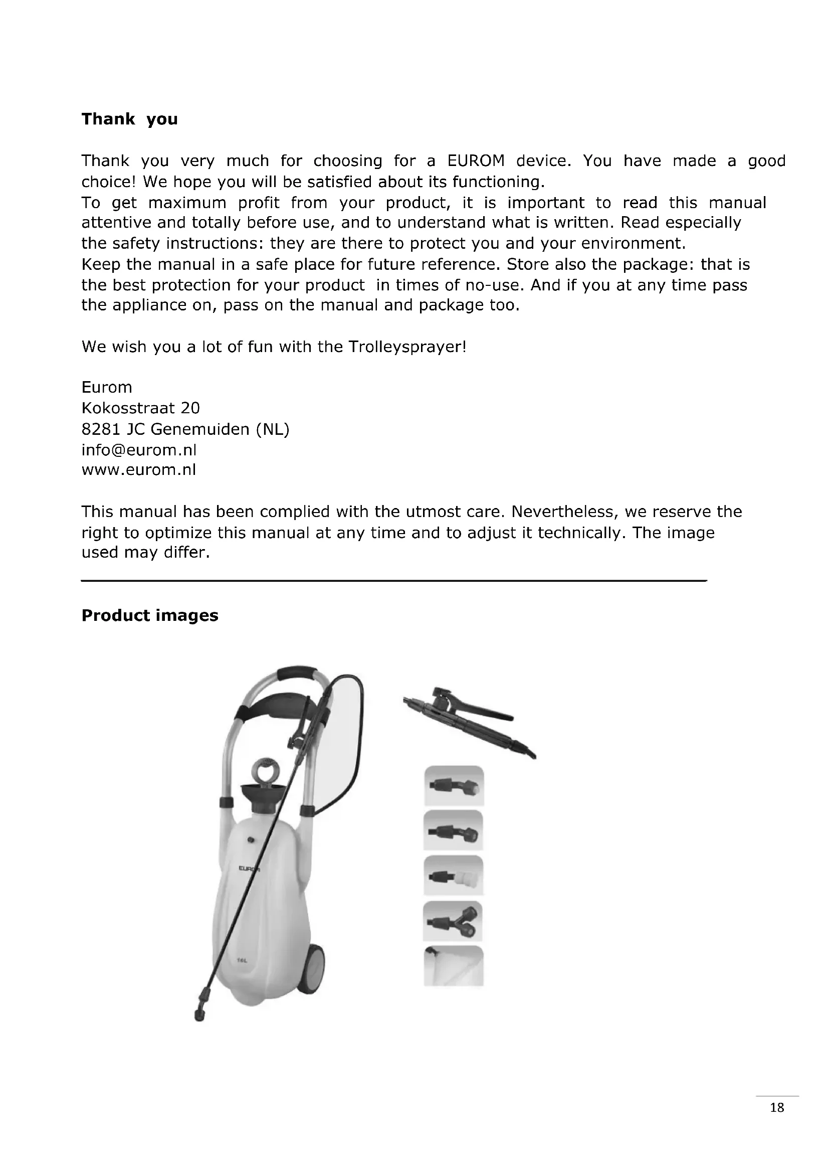 - Trouble shooting Thank you Thank you very much for choosing for a EUROM device. You have made a good choice! We hope you will be satisfied about its functioning. To get maximum profit from your product, it is important to read this manual attentive and totally before use, and to understand what is written. Read especially the safety instructions: they are there to protect you and your environment. Keep the manual in a safe place for future reference. Store also the package: that is the best protection for your product in times of no-use. And if you at any time pass the appliance on, pass on the manual and package too. We wish you a lot of fun with the Trolleysprayer! Eurom Kokosstraat 20 8281 JC Genemuiden (NL) info@eurom.nl www.eurom.nl This manual has been complied with the utmost care. Nevertheless, we reserve the right to optimize this manual at any time and to adjust it technically. The image used may differ. p. 2318