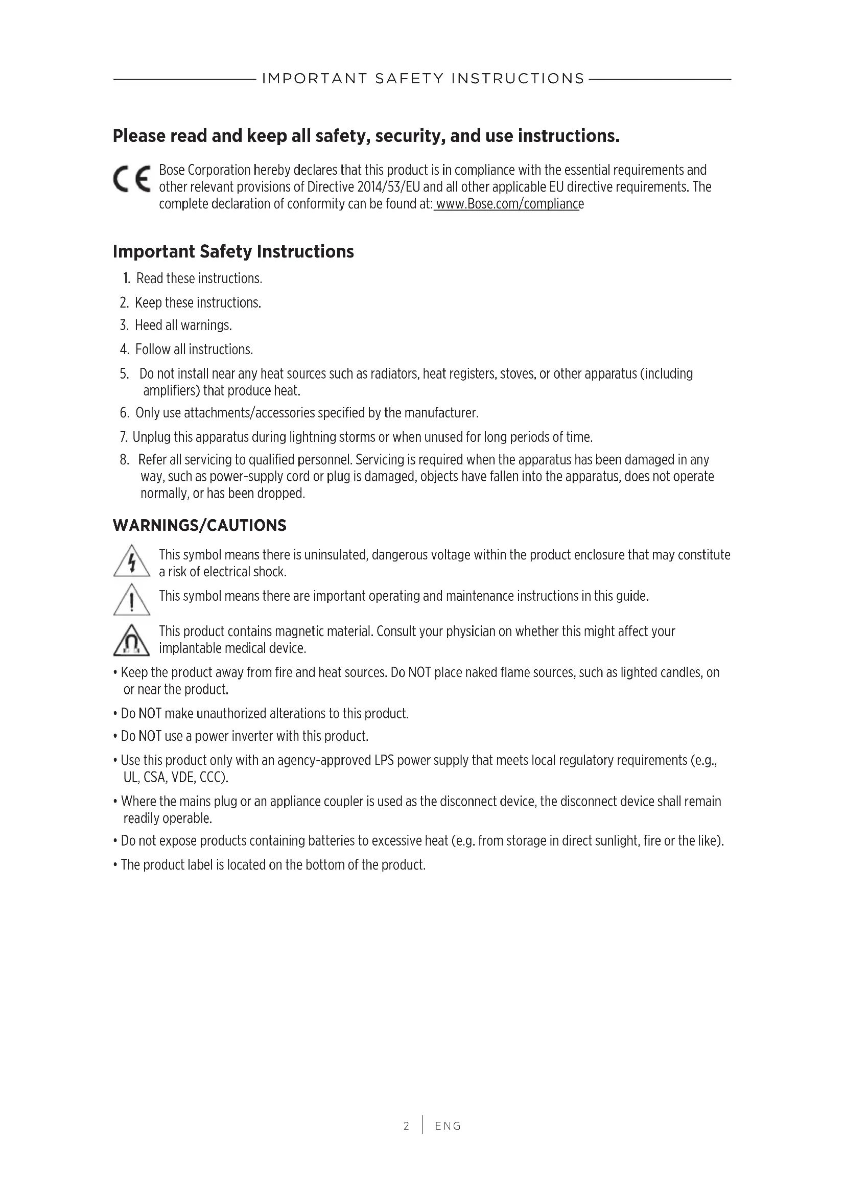 ENG Please read and keep all safety, security, and use instructions. Bose Corporation hereby declares that this product is in compliance with the essential requirements and other relevant provisions of Directive 2014/53/EU and all other applicable EU directive requirements. The complete declaration of conformity can be found at: www.Bose.com/compliance Important Safety Instructions