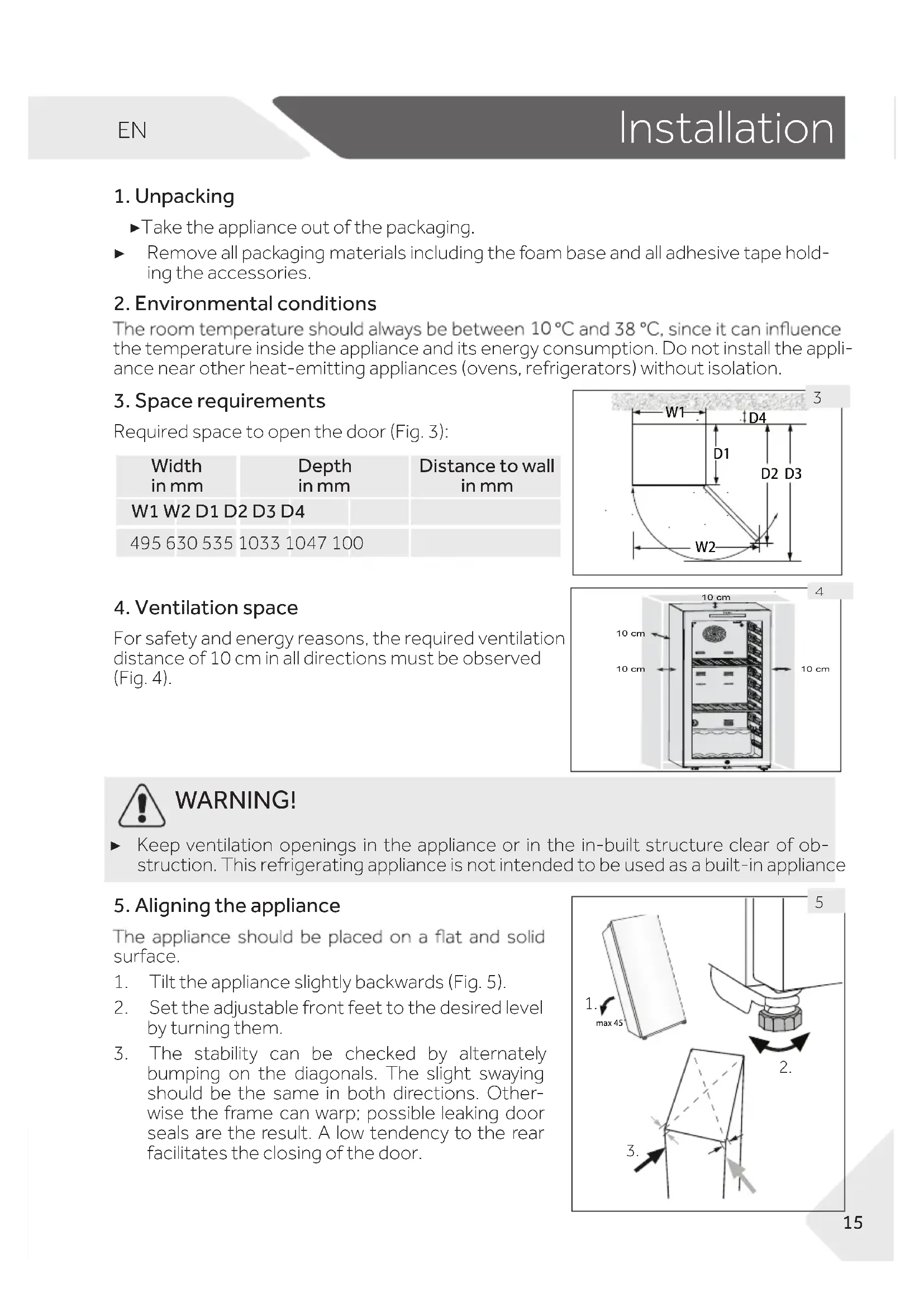 WARNING! ▶ Keep ventilation openings in the appliance or in the in-built structure clear of ob- struction. This refrigerating appliance is not intended to be used as a built-in applianceEN Installation