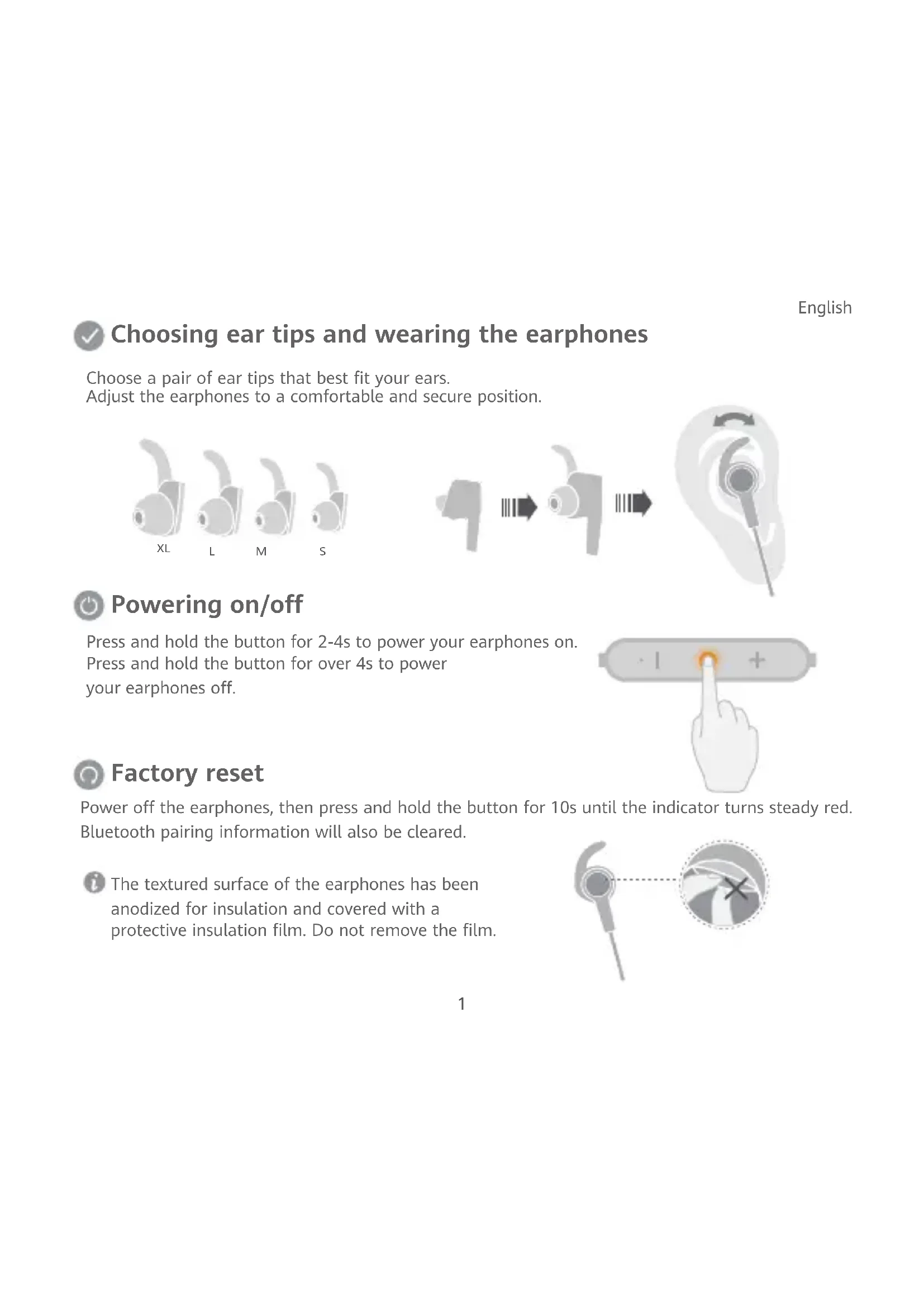 Quick Start Guide AM61Power o the earphones, then press and hold the button for 10s until the indicator turns steady red. Bluetooth pairing information will also be cleared. Factory reset Press and hold the button for 2-4s to power your earphones on. Press and hold the button for over 4s to power your earphones o. Powering on/o Adjust the earphones to a comfortable and secure position. Choose a pair of ear tips that best fit your ears. Choosing ear tips and wearing the earphones