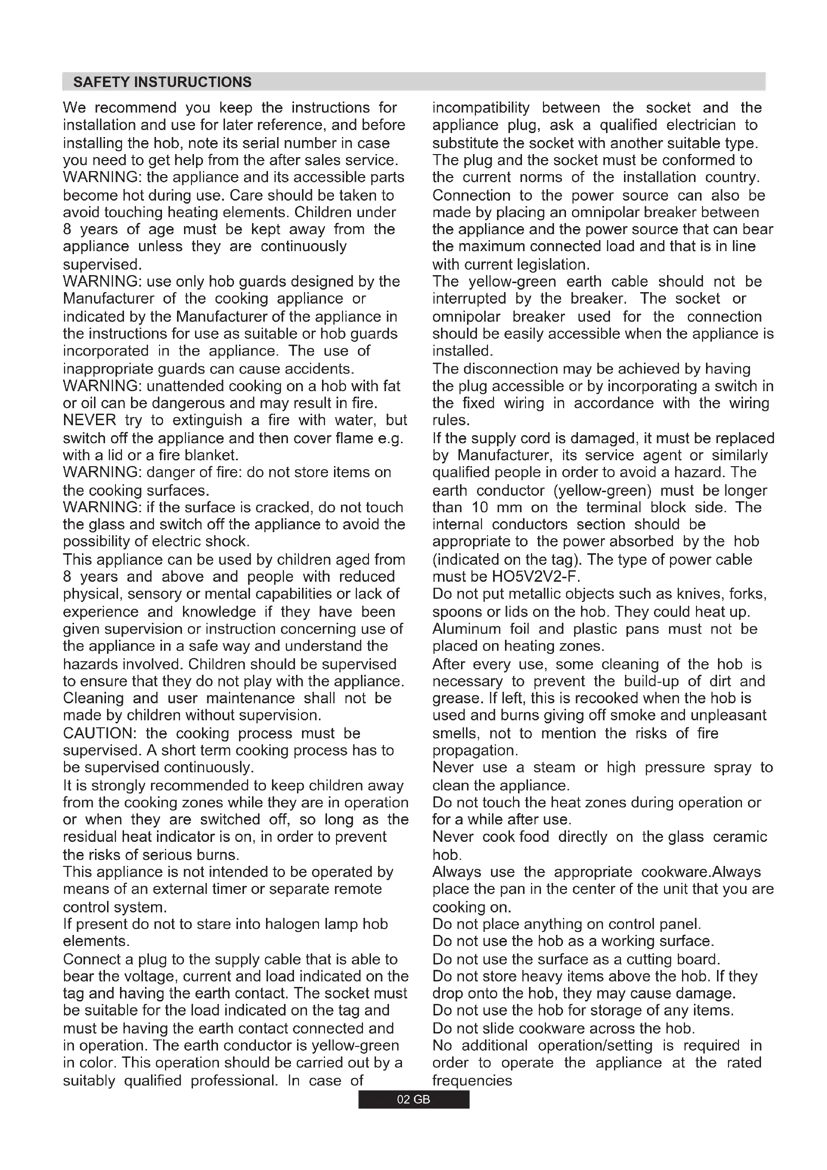 5602 GB SAFETY INSTURUCTIONS We recommend you keep the instructions for installation and use for later reference, and before installing the hob, note its serial number in case you need to get help from the after sales service.