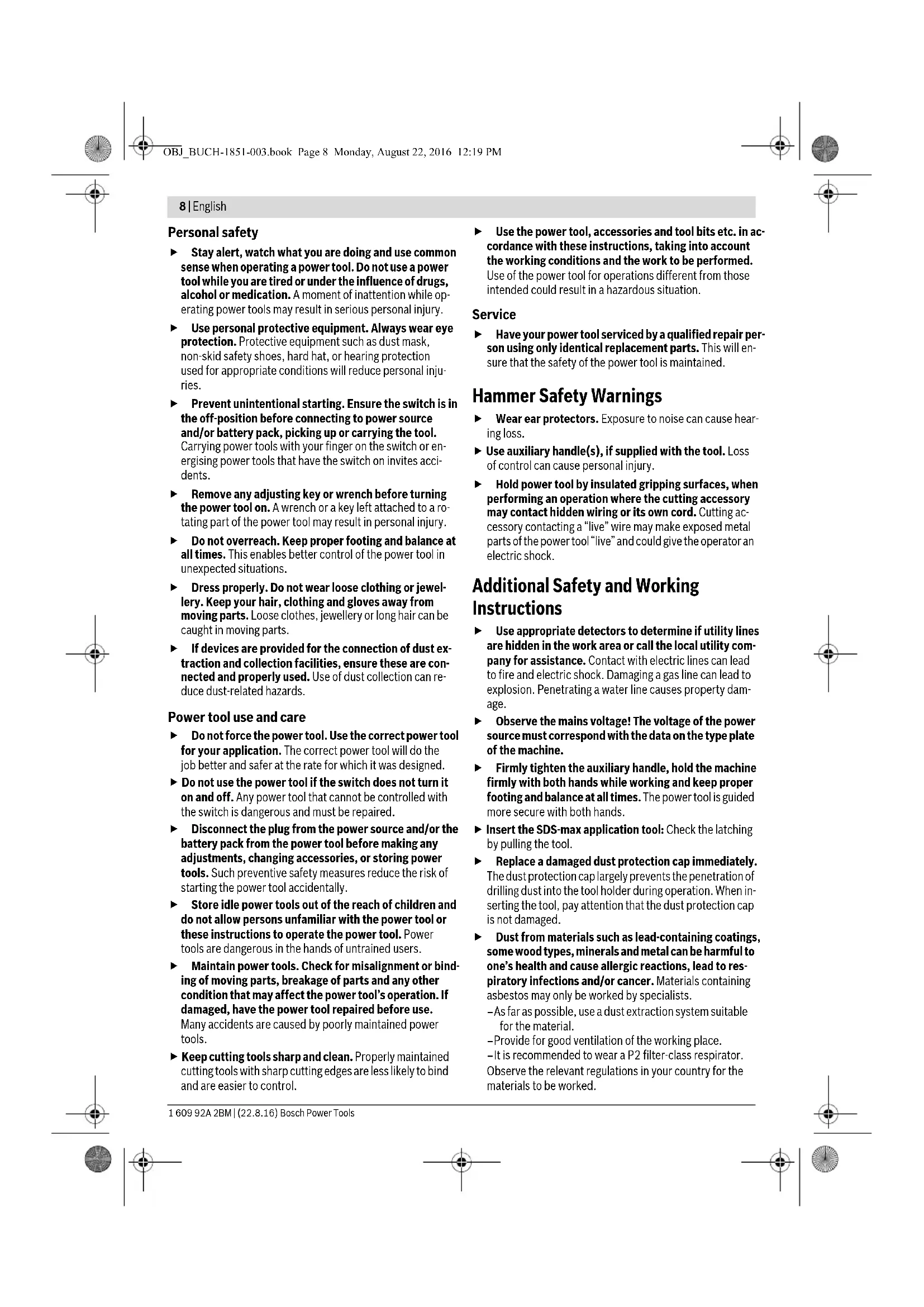 Service-Anzeige beachten 7 148 OBJ_BUCH-1851-003.book Page 6 Monday, August 22, 2016 12:19 PMEnglish | 7 Bosch Power Tools 1 609 92A 2BM | (22.8.16) Wenn die Service-Anzeige in regelmäßigen Abständen blinkt, ist das Elektrowerkzeug defekt. Verwenden Sie in diesem Fall das Elektrowerkzeug nicht weiter und schicken Sie es sofort an den Kundendienst. Kundendienst und Anwendungsberatung Der Kundendienst beantwortet Ihre Fragen zu Reparatur und Wartung Ihres Produkts sowie zu Ersatzteilen. Explosionszeich- nungen und Informationen zu Ersatzteilen finden Sie auch unter: www.bosch-pt.com Das Bosch-Anwendungsberatungs-Team hilft Ihnen gerne bei Fragen zu unseren Produkten und deren Zubehör. www.powertool-portal.de, das Internetportal für Hand- werker und Heimwerker. Geben Sie bei allen Rückfragen und Ersatzteilbestellungen bitte unbedingt die 10-stellige Sachnummer laut Typenschild des Produkts an. Deutschland Robert Bosch Power Tools GmbH Servicezentrum Elektrowerkzeuge Zur Luhne 2 37589 Kalefeld – Willershausen Unter www.bosch-pt.com können Sie online Ersatzteile bestellen oder Reparaturen anmelden. Kundendienst: Tel.: (0711) 40040460 Fax: (0711) 40040461 E-Mail: Servicezentrum.Elektrowerkzeuge@de.bosch.com Anwendungsberatung: Tel.: (0711) 40040460 Fax: (0711) 40040462 E-Mail: kundenberatung.ew@de.bosch.com Österreich Unter www.bosch-pt.at können Sie online Ersatzteile bestellen. Tel.: (01) 797222010 Fax: (01) 797222011 E-Mail: service.elektrowerkzeuge@at.bosch.com Schweiz Unter www.bosch-pt.com/ch/de können Sie online Ersatzteile bestellen. Tel.: (044) 8471511 Fax: (044) 8471551 E-Mail: Aftersales.Service@de.bosch.com Luxemburg Tel.: +32 2 588 0589 Fax: +32 2 588 0595 E-Mail: outillage.gereedschap@be.bosch.com Entsorgung Elektrowerkzeuge, Zubehör und Verpackungen sollen einer umweltgerechten Wiederverwertung zugeführt werden. Werfen Sie Elektrowerkzeuge nicht in den Hausmüll! Nur für EU-Länder: Gemäß der Europäischen Richtlinie 2012/19/EU über Elektro- und Elektronik- Altgeräte und ihrer Umsetzung in nationales Recht müssen nicht mehr gebrauchsfähige Elektrowerkzeuge getrennt gesammelt und einer umweltgerechten Wiederverwertung zugeführt werden. Änderungen vorbehalten. English General Power Tool Safety Warnings Read all safety warnings and all instruc- tions. Failure to follow the warnings and instructions may result in electric shock, fire and/or serious injury. Save all warnings and instructions for future reference. The term “power tool” in the warnings refers to your mains- operated (corded) power tool or battery-operated (cordless) power tool. Work area safety Keep work area clean and well lit. Cluttered or dark areas invite accidents. Do not operate power tools in explosive atmospheres, such as in the presence of flammable liquids, gases or dust. Power tools create sparks which may ignite the dust or fumes. Keep children and bystanders away while operating a power tool. Distractions can cause you to lose control. Electrical safety Power tool plugs must match the outlet. Never modify the plug in any way. Do not use any adapter plugs with earthed (grounded) power tools. Unmodified plugs and matching outlets will reduce risk of electric shock. Avoid body contact with earthed or grounded surfaces, such as pipes, radiators, ranges and refrigerators. There is an increased risk of electric shock if your body is earthed or grounded. Do not expose power tools to rain or wet conditions. Water entering a power tool will increase the risk of electric shock. Do not abuse the cord. Never use the cord for carrying, pulling or unplugging the power tool. Keep cord away from heat, oil, sharp edges and moving parts. Damaged or entangled cords increase the risk of electric shock. When operating a power tool outdoors, use an exten- sion cord suitable for outdoor use. Use of a cord suitable for outdoor use reduces the risk of electric shock. If operating a power tool in a damp location is unavoid- able, use a residual current device (RCD) protected supply. Use of an RCD reduces the risk of electric shock. WARNING OBJ_BUCH-1851-003.book Page 7 Monday, August 22, 2016 12:19 PM8 | English 1 609 92A 2BM | (22.8.16) Bosch Power Tools Personal safety Stay alert, watch what you are doing and use common sense when operating a power tool. Do not use a power tool while you are tired or under the influence of drugs, alcohol or medication. A moment of inattention while op- erating power tools may result in serious personal injury. Use personal protective equipment. Always wear eye protection. Protective equipment such as dust mask, non-skid safety shoes, hard hat, or hearing protection used for appropriate conditions will reduce personal inju- ries. Prevent unintentional starting. Ensure the switch is in the off-position before connecting to power source and/or battery pack, picking up or carrying the tool. Carrying power tools with your finger on the switch or en- ergising power tools that have the switch on invites acci- dents. Remove any adjusting key or wrench before turning the power tool on. A wrench or a key left attached to a ro- tating part of the power tool may result in personal injury. Do not overreach. Keep proper footing and balance at all times. This enables better control of the power tool in unexpected situations. Dress properly. Do not wear loose clothing or jewel- lery. Keep your hair, clothing and gloves away from moving parts. Loose clothes, jewellery or long hair can be caught in moving parts. If devices are provided for the connection of dust ex- traction and collection facilities, ensure these are con- nected and properly used. Use of dust collection can re- duce dust-related hazards. Power tool use and care Do not force the power tool. Use the correct power tool for your application. The correct power tool will do the job better and safer at the rate for which it was designed. Do not use the power tool if the switch does not turn it on and off. Any power tool that c