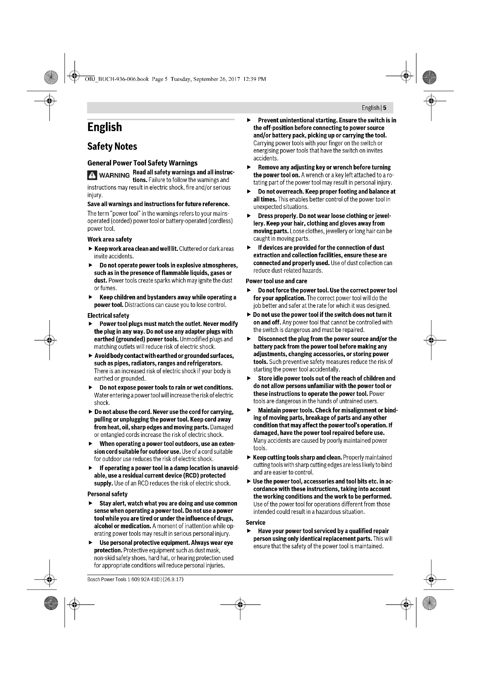 OBJ_BUCH-936-006.book Page 4 Tuesday, September 26, 2017 12:39 PMEnglish | 5 Bosch Power Tools 1 609 92A 41D | (26.9.17) English Safety Notes General Power Tool Safety Warnings Read all safety warnings and all instruc- tions. Failure to follow the warnings and instructions may result in electric shock, fire and/or serious injury. Save all warnings and instructions for future reference. The term “power tool” in the warnings refers to your mains- operated (corded) power tool or battery-operated (cordless) power tool. Work area safety Keep work area clean and well lit. Cluttered or dark areas invite accidents. Do not operate power tools in explosive atmospheres, such as in the presence of flammable liquids, gases or dust. Power tools create sparks which may ignite the dust or fumes. Keep children and bystanders away while operating a power tool. Distractions can cause you to lose control. Electrical safety Power tool plugs must match the outlet. Never modify the plug in any way. Do not use any adapter plugs with earthed (grounded) power tools. Unmodified plugs and matching outlets will reduce risk of electric shock. Avoid body contact with earthed or grounded surfaces, such as pipes, radiators, ranges and refrigerators. There is an increased risk of electric shock if your body is earthed or grounded. Do not expose power tools to rain or wet conditions. Water entering a power tool will increase the risk of electric shock. Do not abuse the cord. Never use the cord for carrying, pulling or unplugging the power tool. Keep cord away from heat, oil, sharp edges and moving parts. Damaged or entangled cords increase the risk of electric shock. When operating a power tool outdoors, use an exten- sion cord suitable for outdoor use. Use of a cord suitable for outdoor use reduces the risk of electric shock. If operating a power tool in a damp location is unavoid- able, use a residual current device (RCD) protected supply. Use of an RCD reduces the risk of electric shock. Personal safety Stay alert, watch what you are doing and use common sense when operating a power tool. Do not use a power tool while you are tired or under the influence of drugs, alcohol or medication. A moment of inattention while op- erating power tools may result in serious personal injury. Use personal protective equipment. Always wear eye protection. Protective equipment such as dust mask, non-skid safety shoes, hard hat, or hearing protection used for appropriate conditions will reduce personal injuries. Prevent unintentional starting. Ensure the switch is in the off-position before connecting to power source and/or battery pack, picking up or carrying the tool. Carrying power tools with your finger on the switch or energising power tools that have the switch on invites accidents. Remove any adjusting key or wrench before turning the power tool on. A wrench or a key left attached to a ro- tating part of the power tool may result in personal injury. Do not overreach. Keep proper footing and balance at all times. This enables better control of the power tool in unexpected situations. Dress properly. Do not wear loose clothing or jewel- lery. Keep your hair, clothing and gloves away from moving parts. Loose clothes, jewellery or long hair can be caught in moving parts. If devices are provided for the connection of dust extraction and collection facilities, ensure these are connected and properly used. Use of dust collection can reduce dust-related hazards. Power tool use and care Do not force the power tool. Use the correct power tool for your application. The correct power tool will do the job better and safer at the rate for which it was designed. Do not use the power tool if the switch does not turn it on and off. Any power tool that cannot be controlled with the switch is dangerous and must be repaired. Disconnect the plug from the power source and/or the battery pack from the power tool before making any adjustments, changing accessories, or storing power tools. Such preventive safety measures reduce the risk of starting the power tool accidentally. Store idle power tools out of the reach of children and do not allow persons unfamiliar with the power tool or these instructions to operate the power tool. Power tools are dangerous in the hands of untrained users. Maintain power tools. Check for misalignment or bind- ing of moving parts, breakage of parts and any other condition that may affect the power tool’s operation. If damaged, have the power tool repaired before use. Many accidents are caused by poorly maintained power tools. Keep cutting tools sharp and clean. Properly maintained cutting tools with sharp cutting edges are less likely to bind and are easier to control. Use the power tool, accessories and tool bits etc. in ac- cordance with these instructions, taking into account the working conditions and the work to be performed. Use of the power tool for operations different from those intended could result in a hazardous situation. Service Have your power tool serviced by a qualified repair person using only identical replacement parts. This will ensure that the safety of the power tool is maintained. WARNING OBJ_BUCH-936-006.book Page 5 Tuesday, September 26, 2017 12:39 PM6 | English 1 609 92A 41D | (19.10.17) Bosch Power Tools Cut-off machine safety warnings The guard provided with the tool must be securely attached to the power tool and positioned for maxi- mum safety, so the least amount of wheel is exposed towards the operator. Position yourself and bystand- ers away from the plane of the rotating wheel. The guard helps to protect operator from broken wheel frag- ments and accidental contact with wheel. Use only diamond cut-off wheels for your power tool. Just because an accessory can be attached to your power tool, it does not assure safe operation. The rated speed of the accessory must be at least equal to the maximum speed marked on the power tool. Accessories running faster than their rated speed can brea
