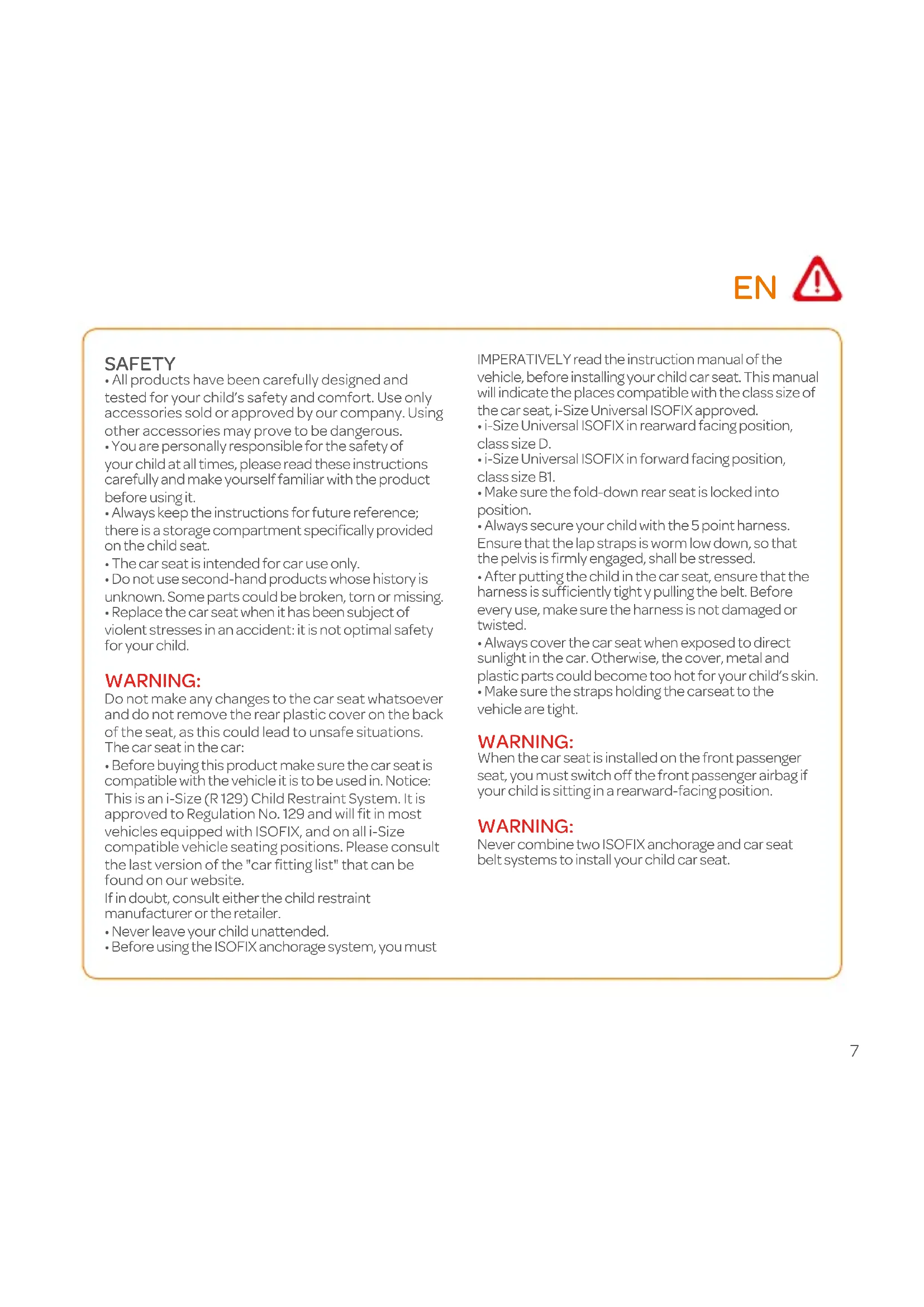 - Before using the ISOFIX anchorage system, you must IMPERATIVELY read the instruction manual of the vehicle, before installing your child car seat. This manual will indicate the places compatible with the class size of the car seat, i-Size Universal ISOFIX approved.