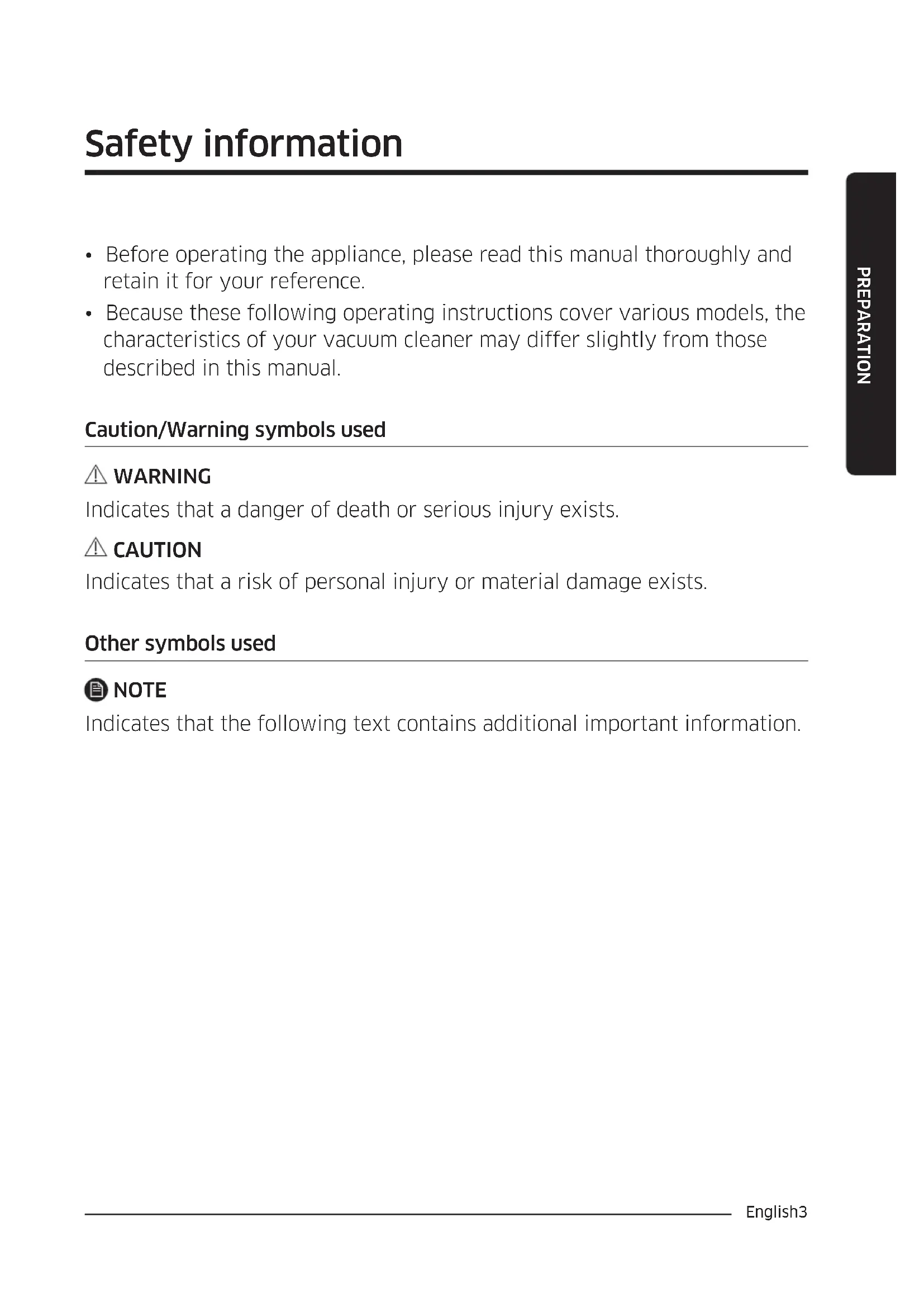 - Because these following operating instructions cover various models, the characteristics of your vacuum cleaner may differ slightly from those described in this manual. Caution/Warning symbols used WARNING Indicates that a danger of death or serious injury exists. CAUTION Indicates that a risk of personal injury or material damage exists. Other symbols used NOTE Indicates that the following text contains additional important information. Safety information PREPARATION 1_VC3100_EN_00753Q-01_AP.indd 3 2019-06-26 오후 4:27:36English