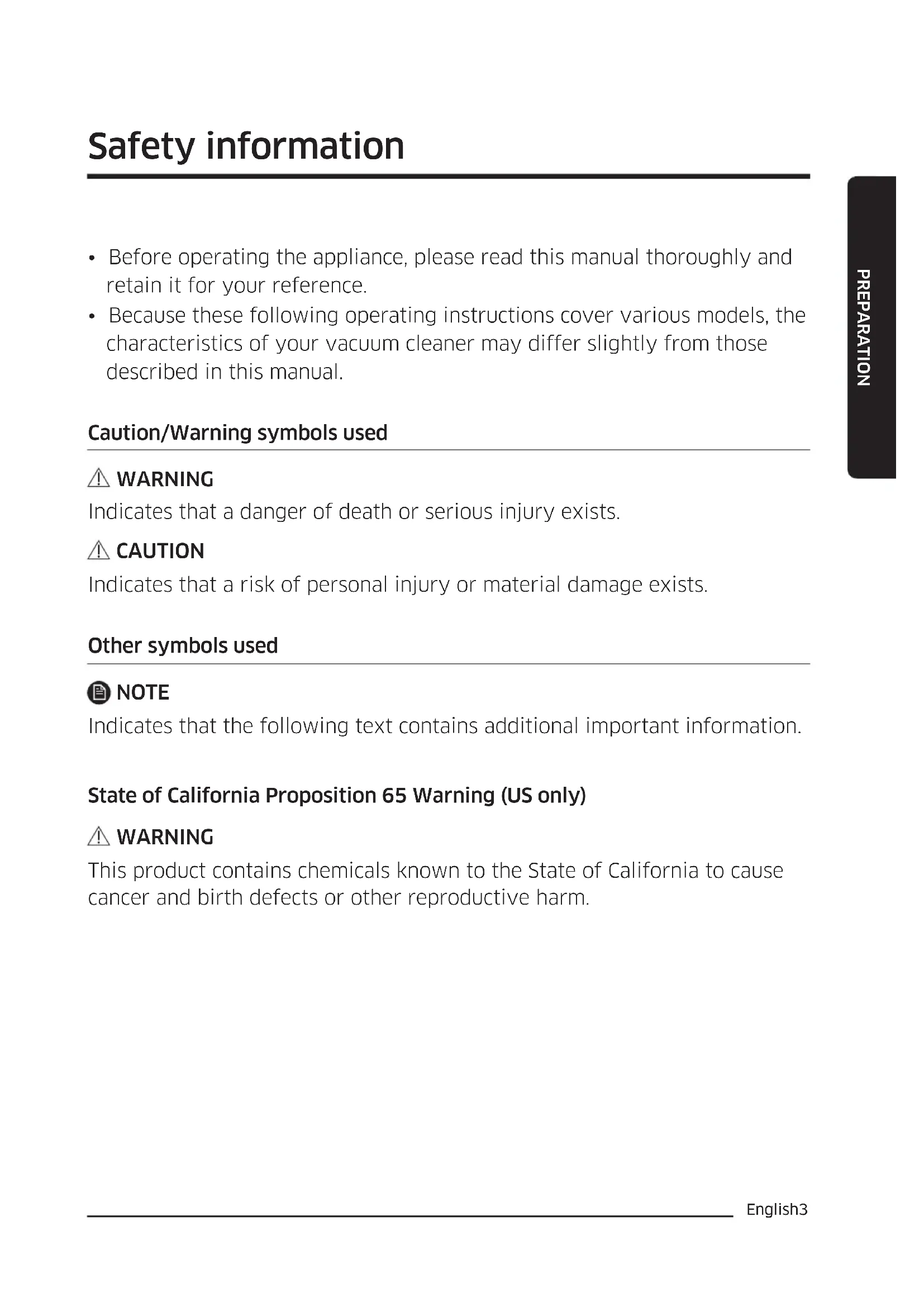 - Because these following operating instructions cover various models, the characteristics of your vacuum cleaner may differ slightly from those described in this manual. Caution/Warning symbols used WARNING Indicates that a danger of death or serious injury exists. CAUTION Indicates that a risk of personal injury or material damage exists. Other symbols used NOTE Indicates that the following text contains additional important information. State of California Proposition 65 Warning (US only) WARNING This product contains chemicals known to the State of California to cause cancer and birth defects or other reproductive harm. Safety information PREPARATION 1_VC3100_EN_00753B-00_USA.indd 3 2016-12-27 오후 8:48:34English