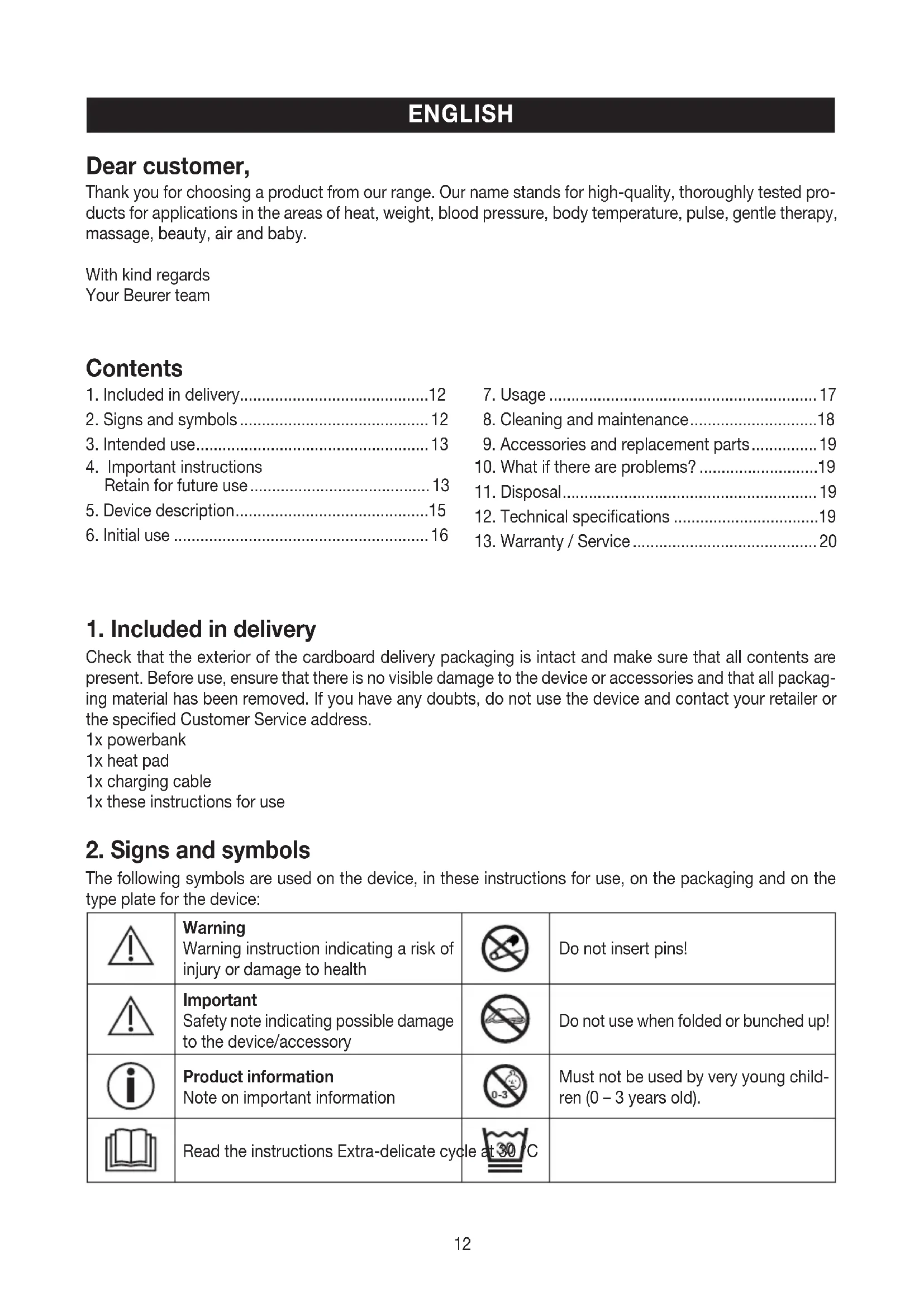 The following symbols are used on the device, in these instructions for use, on the packaging and on the type plate for the device: Warning Warning instruction indicating a risk of injury or damage to health Do not insert pins! Important Safety note indicating possible damage to the device/accessory Do not use when folded or bunched up! Product information Note on important information Must not be used by very young child- ren (0 – 3 years old). Read the instructions Extra-delicate cycle at 30°C Contents Dear customer, Thank you for choosing a product from our range. Our name stands for high-quality, thoroughly tested pro- ducts for applications in the areas of heat, weight, blood pressure, body temperature, pulse, gentle therapy, massage, beauty, air and baby. With kind regards Your Beurer team13 Disposal in accordance with the Waste Electrical and Electronic Equipment EC Directive – WEEE Do not bleach