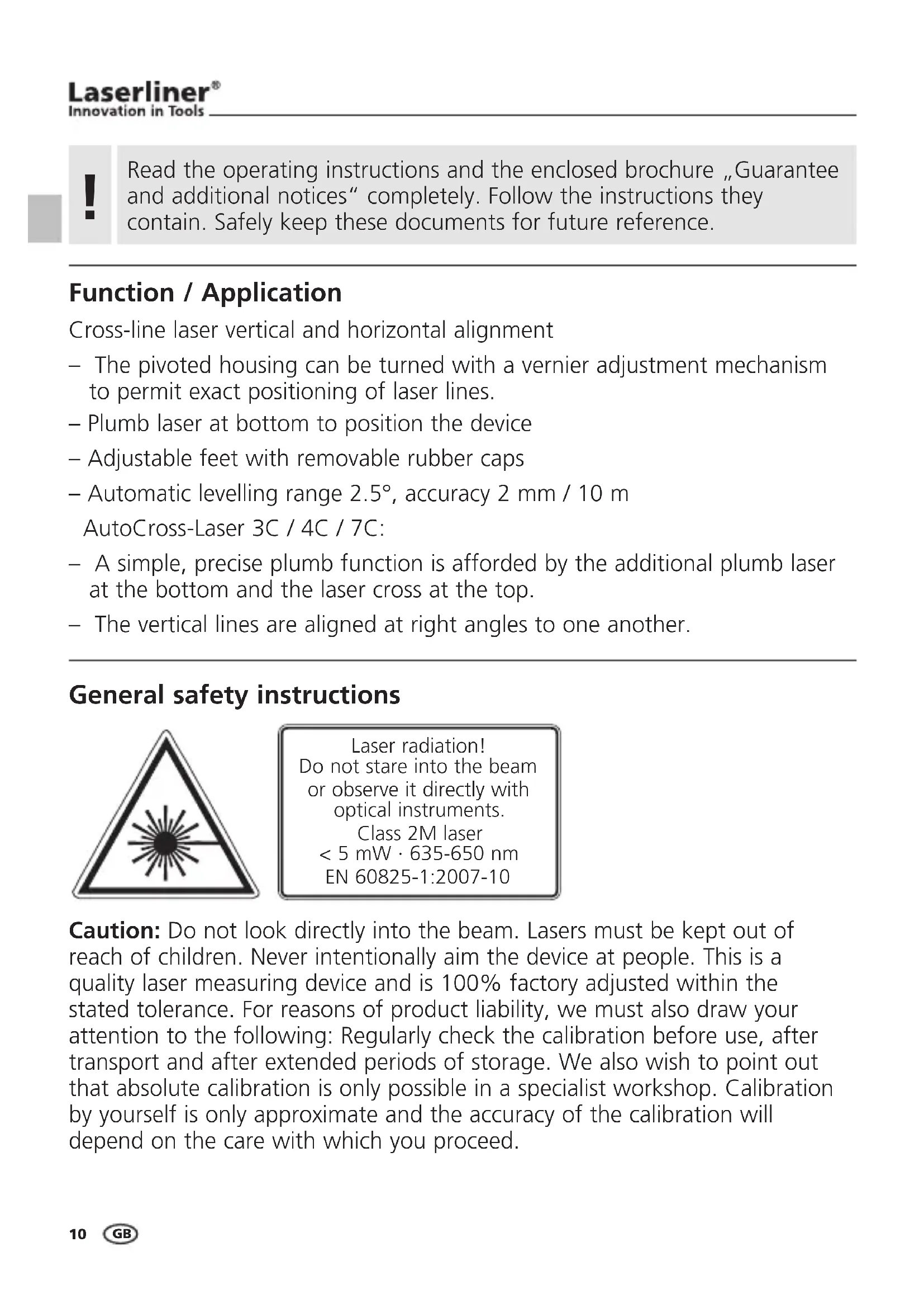 AutoCross-Laser 2C / 3C / 4C / 7C Technische Daten (technische Änderungen vorbehalten) Selbstnivellierbereich ± 2,5° Genauigkeit ± 2 mm / 10 m Laserwellenlänge Linienlaser / Lotlaser 635 nm / 650 nm Laserklasse / Ausgangsleistung Linienlaser 2M / < 5 mW (EN 60825-1:2007-10) Laserklasse / Ausgangsleistung Lotlaser 2 / < 1 mW (EN 60825-1:2007-10) Stromversorgung 3 x 1,5V AA Betriebsdauer ACL 2C / ACL 3C ca. 16 Std. Betriebsdauer ACL 4C ca. 12 Std. Betriebsdauer ACL 7C ca. 9 Std. Arbeitstemperatur 0°C ... + 50°C Lagertemperatur -10°C ... + 70°C Gewicht ACL 2C (inkl. Batterien) 1,2 kg Gewicht ACL 3C / ACL 7C (inkl. Batterien) 1,4 kg Gewicht ACL 4C (inkl. Batterien) 1,6 kg Abmessungen ACL 2C (B x H x T) 110 x 185 x 115 mm Abmessungen ACL 3C (B x H x T) 120 x 190 x 120 mm Abmessungen ACL 4C / 7C (B x H x T) 120 x 195 x 130 mm Manual_ACL-2C,3C,4C,7C_Rev.0512_DE-SE.indd 09 31.05.12 14:4610 Function / Application Cross-line laser vertical and horizontal alignment – The pivoted housing can be turned with a vernier adjustment mechanism to permit exact positioning of laser lines. – Plumb laser at bottom to position the device – Adjustable feet with removable rubber caps – Automatic levelling range 2.5°, accuracy 2 mm / 10 m AutoCross-Laser 3C / 4C / 7C: – A simple, precise plumb function is afforded by the additional plumb laser at the bottom and the laser cross at the top. – The vertical lines are aligned at right angles to one another. General safety instructions Caution: Do not look directly into the beam. Lasers must be kept out of reach of children. Never intentionally aim the device at people. This is a quality laser measuring device and is 100% factory adjusted within the stated tolerance. For reasons of product liability, we must also draw your attention to the following: Regularly check the calibration before use, after transport and after extended periods of storage. We also wish to point out that absolute calibration is only possible in a specialist workshop. Calibration by yourself is only approximate and the accuracy of the calibration will depend on the care with which you proceed. Laser radiation! Do not stare into the beam or observe it directly with optical instruments. Class 2M laser < 5 mW · 635-650 nm EN 60825-1:2007-10 Read the operating instructions and the enclosed brochure „Guarantee and additional notices“ completely. Follow the instructions they contain. Safely keep these documents for future reference.