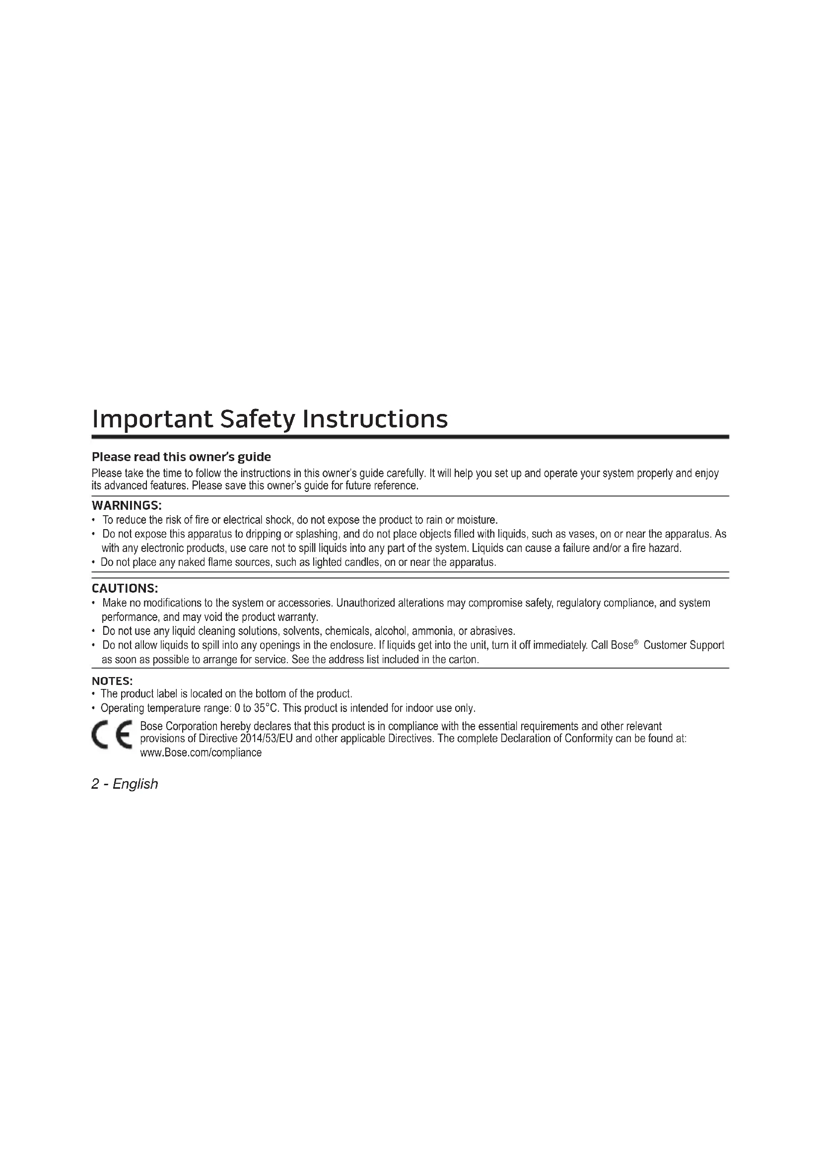 - Operating temperature range: 0 to 35°C. This product is intended for indoor use only. Bose Corporation hereby declares that this product is in compliance with the essential requirements and other relevant provisions of Directive 2014/53/EU and other applicable Directives. The complete Declaration of Conformity can be found at: www.Bose.com/compliance Important Safety InstructionsEnglish - 3 To comply with FCC and Industry Canada RF radiation exposure requirements, this device must be installed to produce a separation distance of 20 cm from all persons. It must not be co-located or operating in conjunction with any other antenna or transmitter. This product complies with the Canadian ICES-003 Class B and RSS-210 specications. In the U.S. only, this product complies with CFR 47 Part 15 specications. This device complies with Industry Canada licence-exempt RSS standard(s). Operation is subject to the following two conditions: (1) This device may not cause interference, and (2) this device must accept any interference, including interference that may cause undesired operation of the device. NOTE: This equipment has been tested and found to comply with the limits for a Class B digital device, pursuant to Part 15 of the FCC Rules. These limits are designed to provide reasonable protection against harmful interference in a residential installation. This equipment generates, uses, and can radiate radio frequency energy and, if not installed and used in accordance with the instructions, may cause harmful interference to radio communications. However, there is no guarantee that interference will not occur in a particular installation. If this equipment does cause harmful interference to radio or television reception, which can be determined by turning the equipment off and on, the user is encouraged to try to correct the interference by one or more of the following measures: