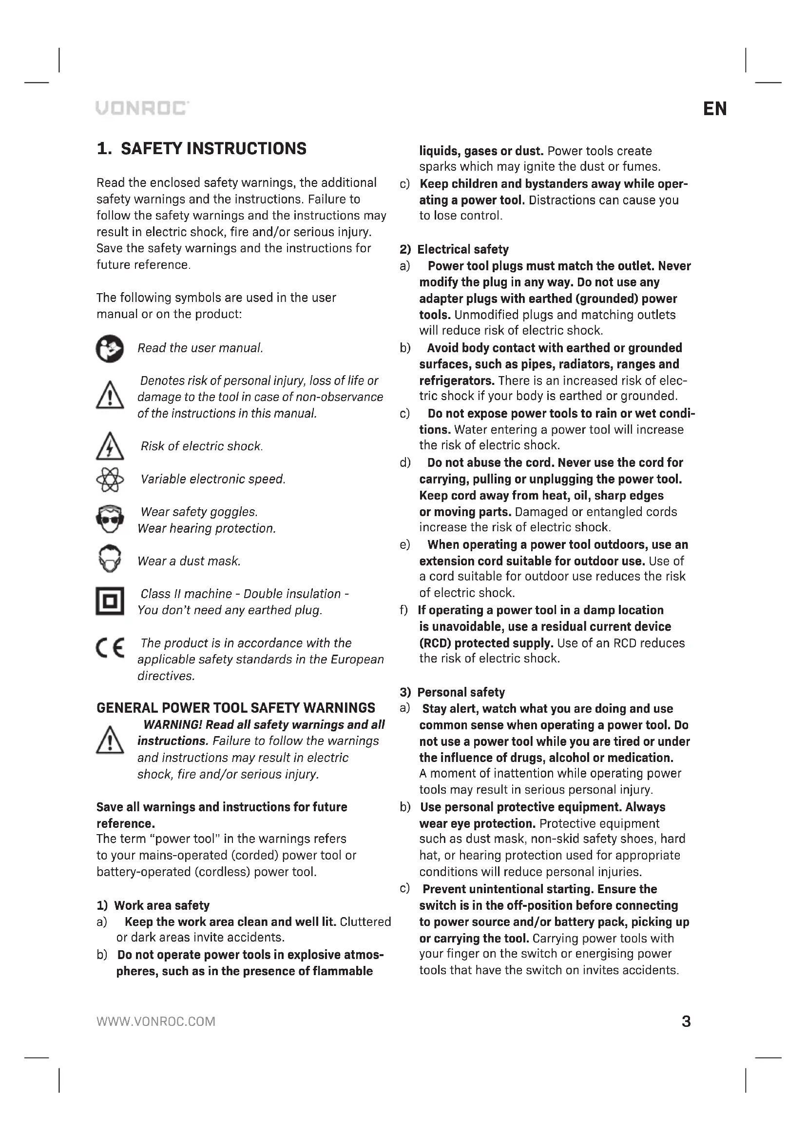 Read the enclosed safety warnings, the additional safety warnings and the instructions. Failure to follow the safety warnings and the instructions may result in electric shock, fire and/or serious injury. Save the safety warnings and the instructions for future reference. The following symbols are used in the user manual or on the product: Read the user manual. Denotes risk of personal injury, loss of life or damage to the tool in case of non-observance of the instructions in this manual. Risk of electric shock. Variable electronic speed. Wear safety goggles. Wear hearing protection. Wear a dust mask. Class II machine - Double insulation - You don’t need any earthed plug. The product is in accordance with the applicable safety standards in the European directives.