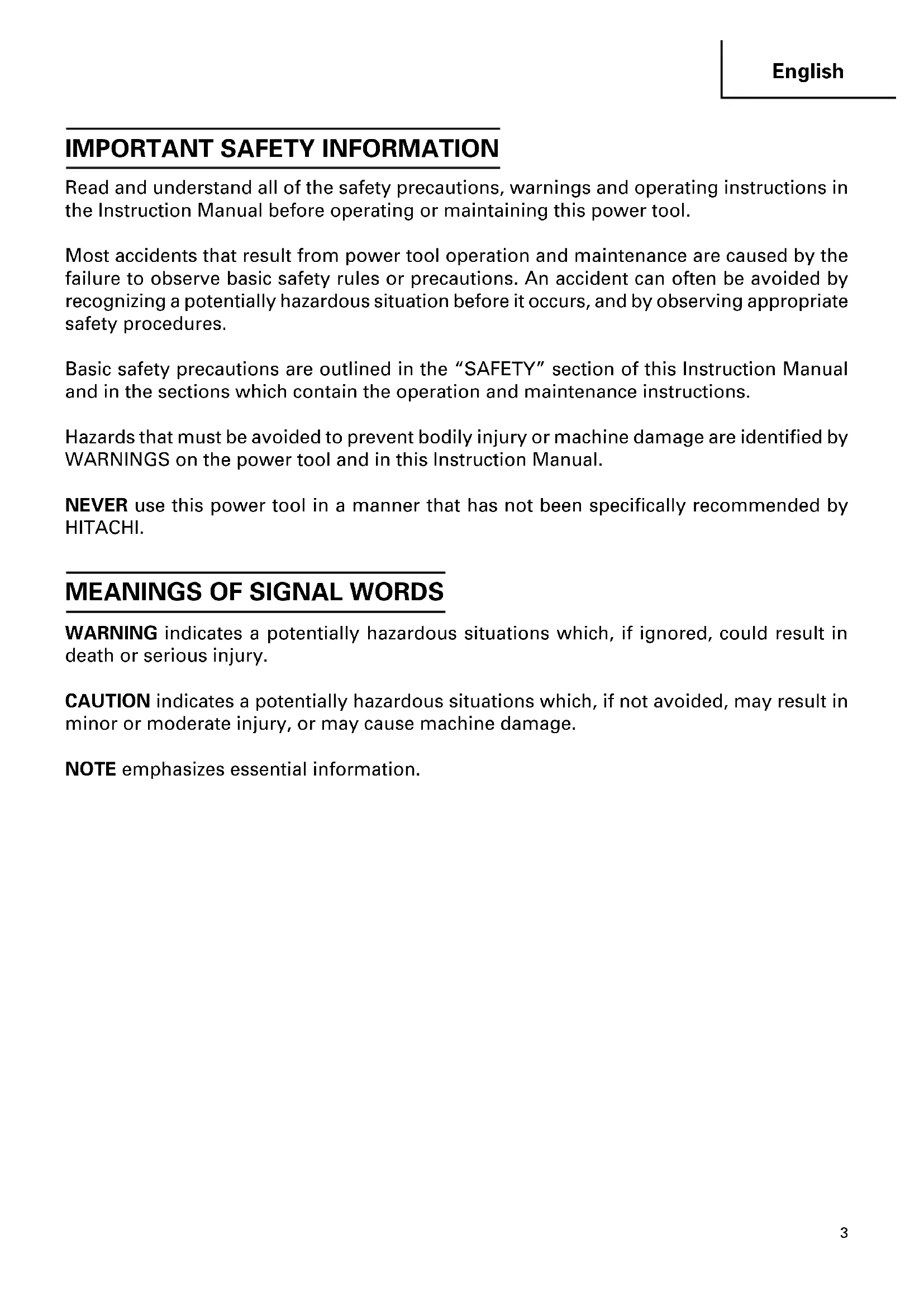Read and understand all of the safety precautions, warnings and operating instructions in the Instruction Manual before operating or maintaining this power tool. Most accidents that result from power tool operation and maintenance are caused by the failure to observe basic safety rules or precautions. An accident can often be avoided by recognizing a potentially hazardous situation before it occurs, and by observing appropriate safety procedures. Basic safety precautions are outlined in the “SAFETY” section of this Instruction Manual and in the sections which contain the operation and maintenance instructions. Hazards that must be avoided to prevent bodily injury or machine damage are identified by WARNINGS on the power tool and in this Instruction Manual. NEVER use this power tool in a manner that has not been specifically recommended by HITACHI.