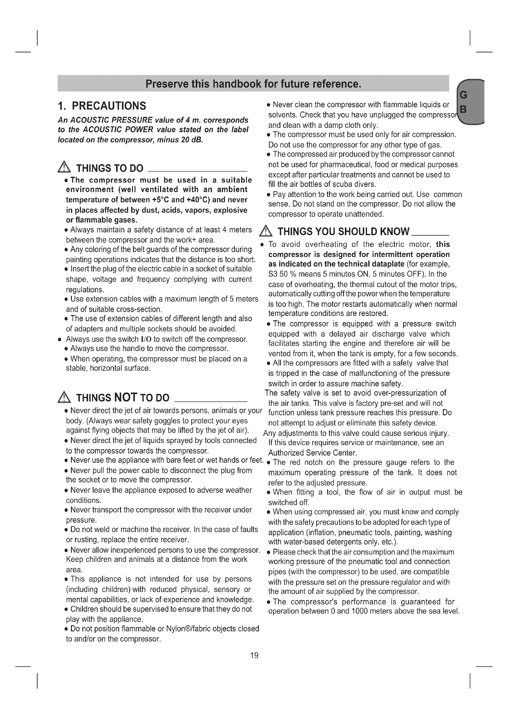 ● To avoid overheating of the electric motor, this compressor is designed for intermittent operation as indicated on the technical dataplate (for example, S3 50 % means 5 minutes ON, 5 minutes OFF). In the case of overheating, the thermal cutout of the motor trips, automatically cutting off the power when the temperature is too high. The motor restarts automatically when normal temperature conditions are restored. ● The compressor is equipped with a pressure switch equipped with a delayed air discharge valve which facilitates starting the engine and therefore air will be vented from it, when the tank is empty, for a few seconds. ● All the compressors are tted with a safety valve that is tripped in the case of malfunctioning of the pressure switch in order to assure machine safety. The safety valve is set to avoid over-pressurization of the air tanks. This valve is factory pre-set and will not function unless tank pressure reaches this pressure. Do not attempt to adjust or eliminate this safety device. Any adjustments to this valve could cause serious injury. If this device requires service or maintenance, see an Authorized Service Center. ● The red notch on the pressure gauge refers to the maximum operating pressure of the tank. It does not refer to the adjusted pressure. ● When tting a tool, the ow of air in output must be switched off. ● When using compressed air, you must know and comply with the safety precautions to be adopted for each type of application (ination, pneumatic tools, painting, washing with water-based detergents only, etc.). ● Please check that the air consumption and the maximum working pressure of the pneumatic tool and connection pipes (with the compressor) to be used, are compatible with the pressure set on the pressure regulator and with the amount of air supplied by the compressor. ● The compressor's performance is guaranteed for operation between 0 and 1000 meters above the sea level. Preserve this handbook for future reference.G