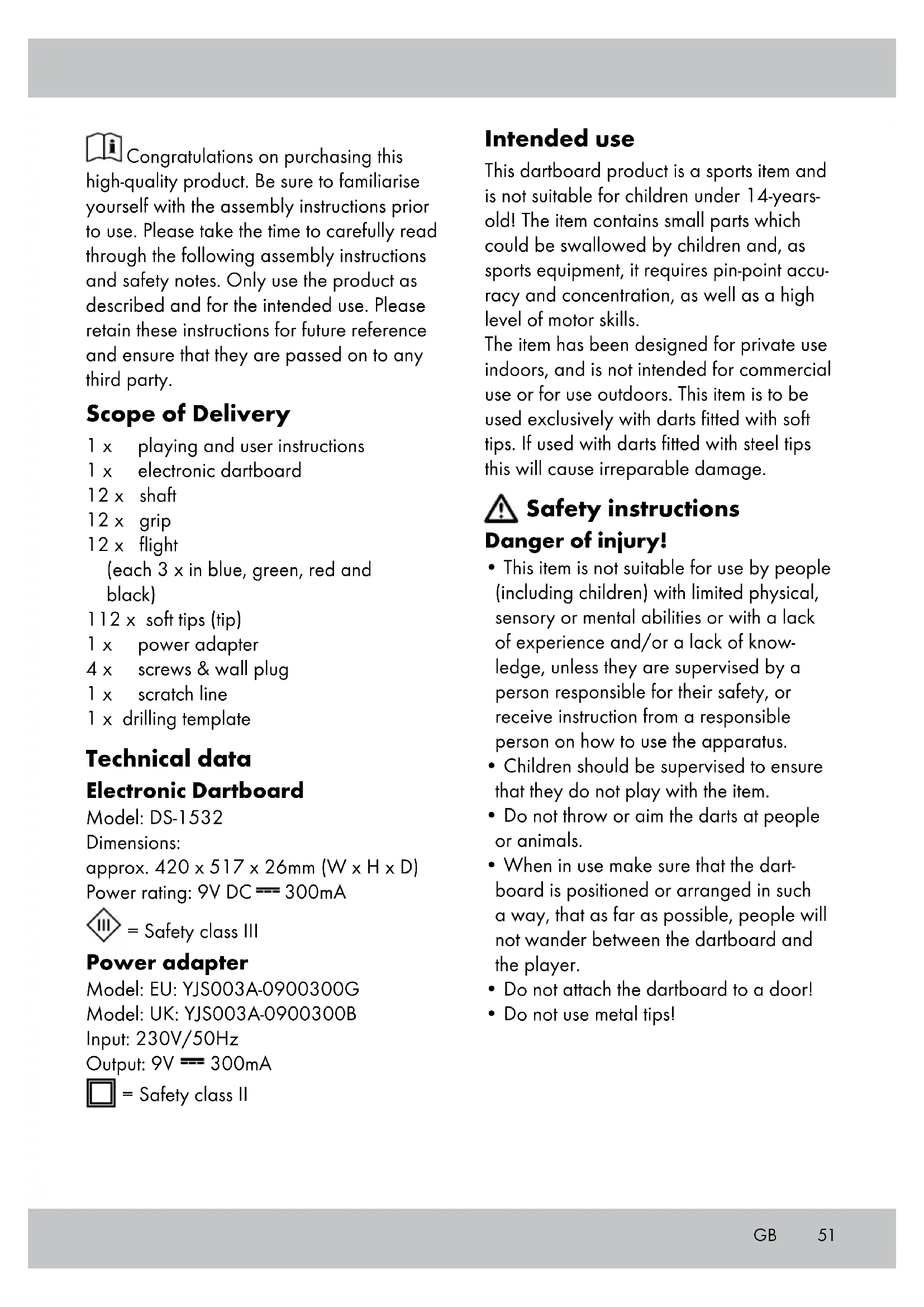 - Only use the adapter in connection with the Dartboard DS-1532.