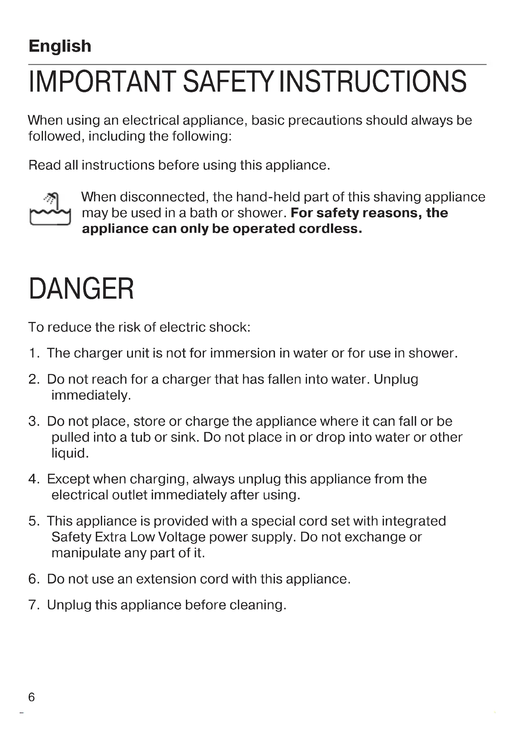 When using an electrical appliance, basic precautions should always be followed, including the following: Read all instructions before using this appliance. When disconnected, the hand-held part of this shaving appliance may be used in a bath or shower. For safety reasons, the appliance can only be operated cordless. DANGER To reduce the risk of electric shock: